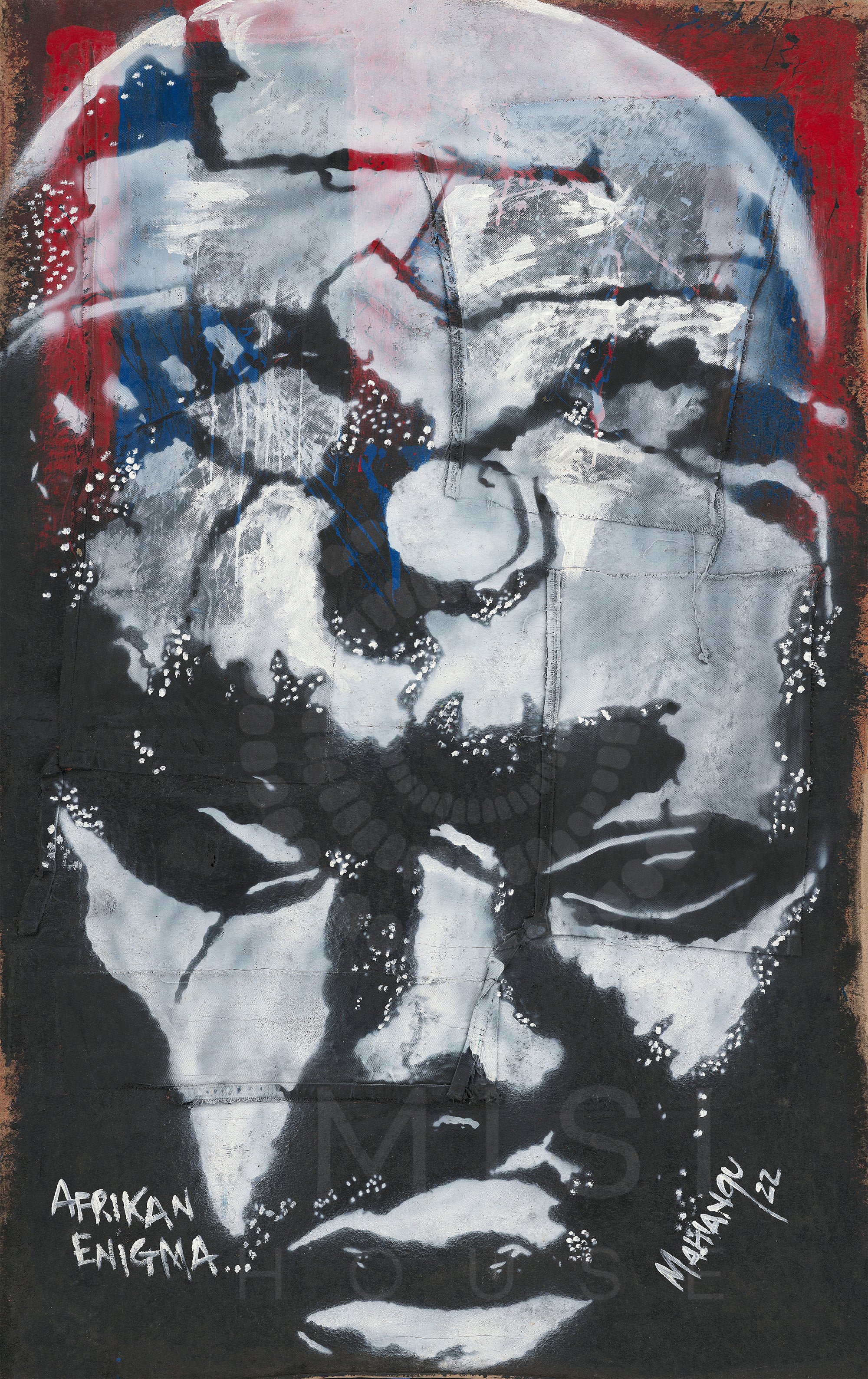 By incorporating denim and acrylic on velvet, the piece bridges past and present, blending contemporary materials with imagery rooted in ancient African civilization. The layered surfaces and fractured textures echo the complexities of history, memory, and identity.