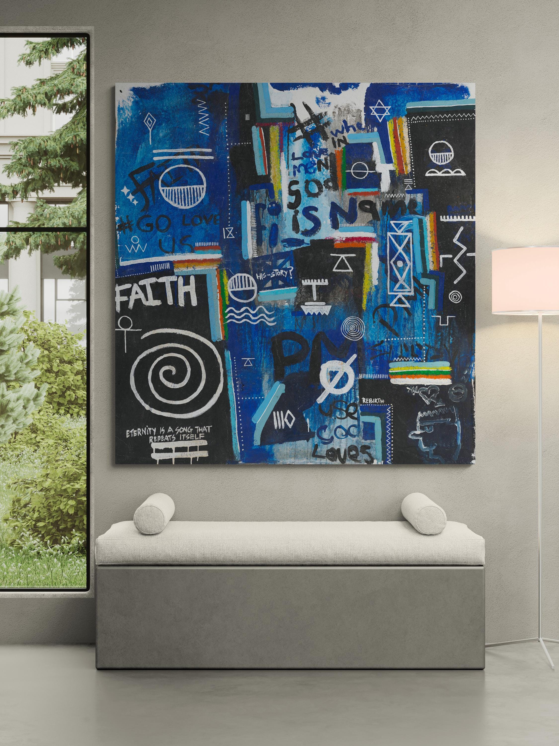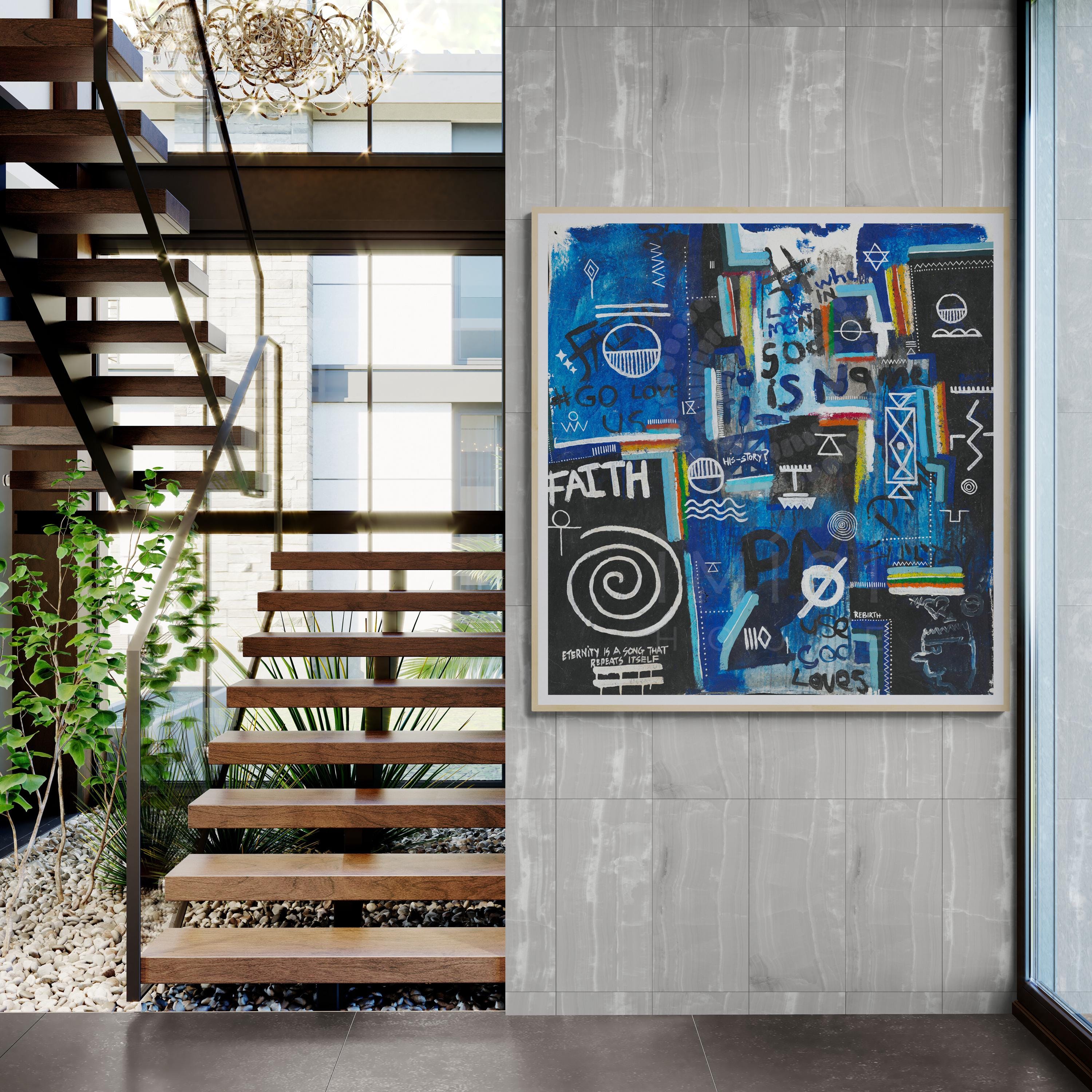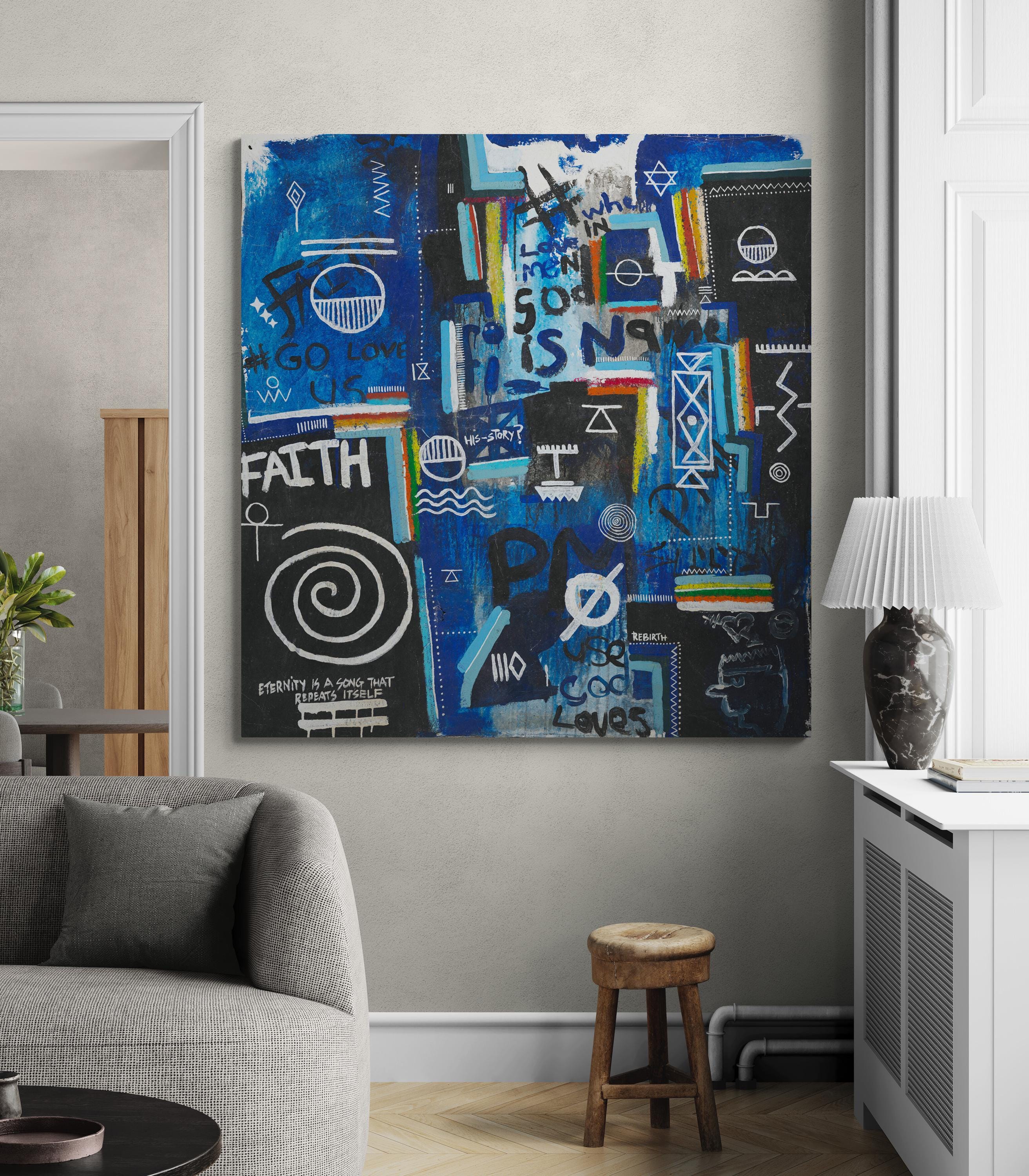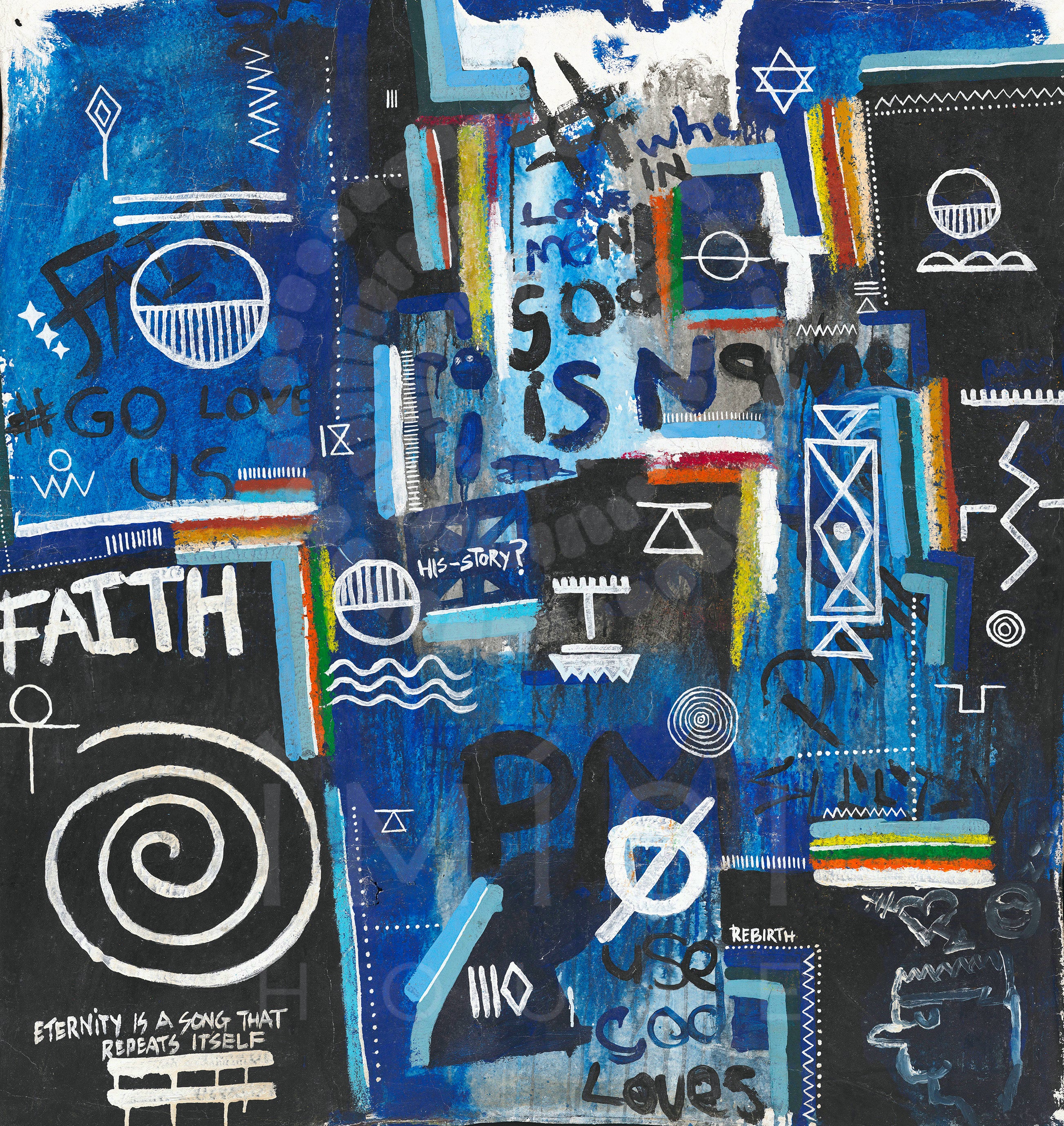 Layered throughout the composition are universal religious and spiritual symbols, woven together with fragments of text such as “faith,” “rebirth,” and “God loves us all.” Rather than presenting a singular doctrine, the piece reflects a convergence of belief systems, pointing to a deeper, collective truth: that love, meaning, and connection exist across cultures, languages, and generations. The visual language; at once chaotic and intentional, mirrors the complexity of human thought while anchoring itself in a quiet, unifying message of divine presence within everyday life.