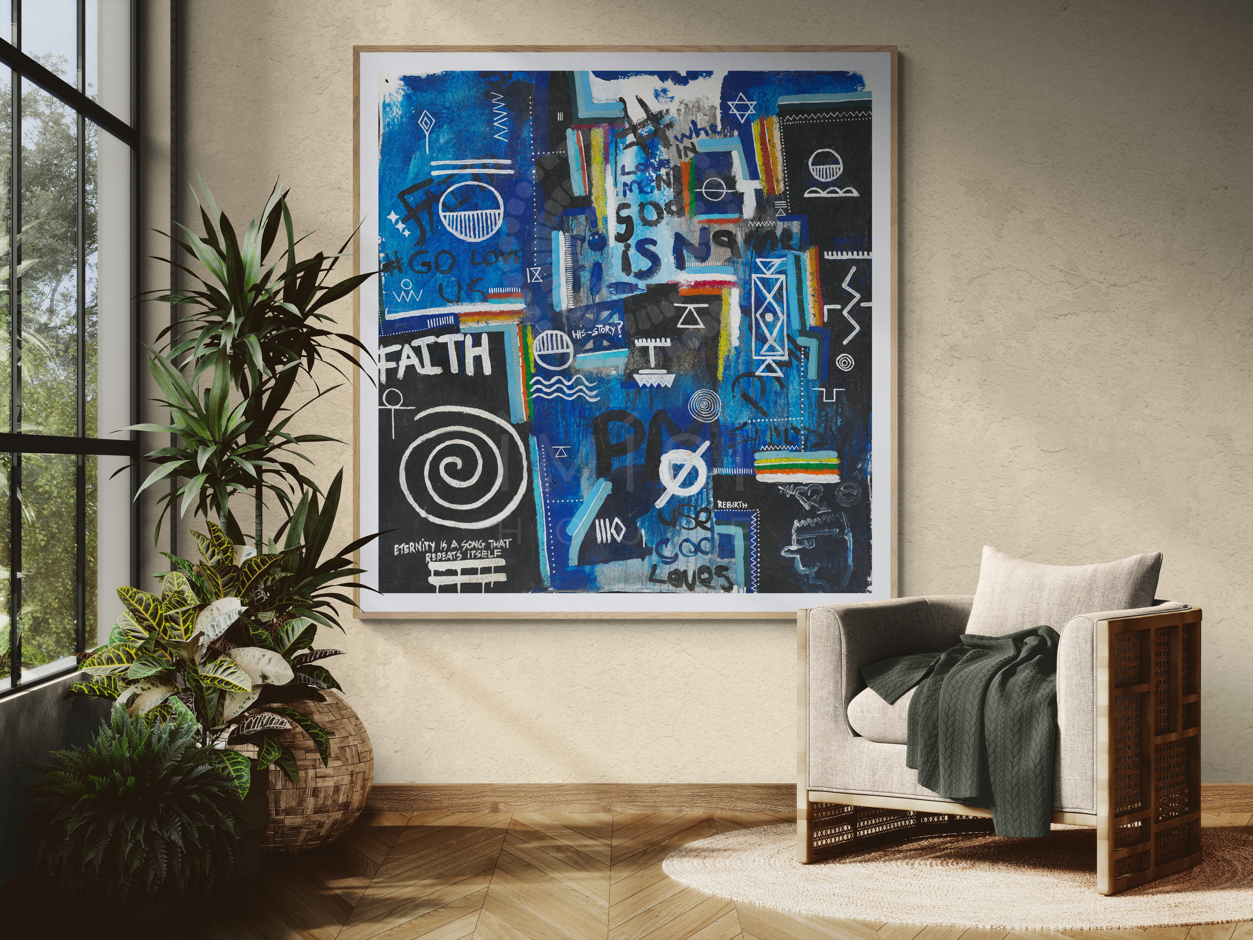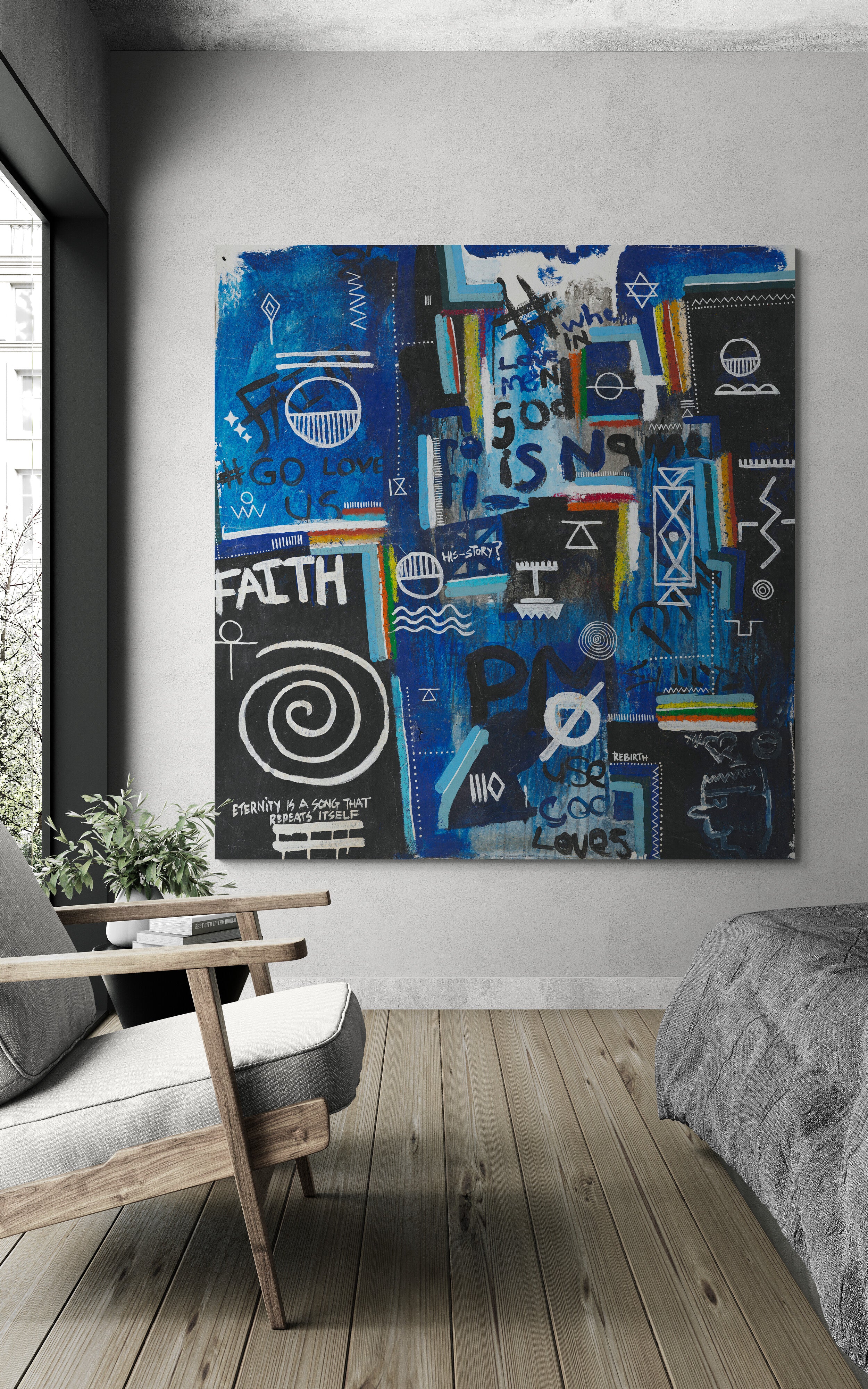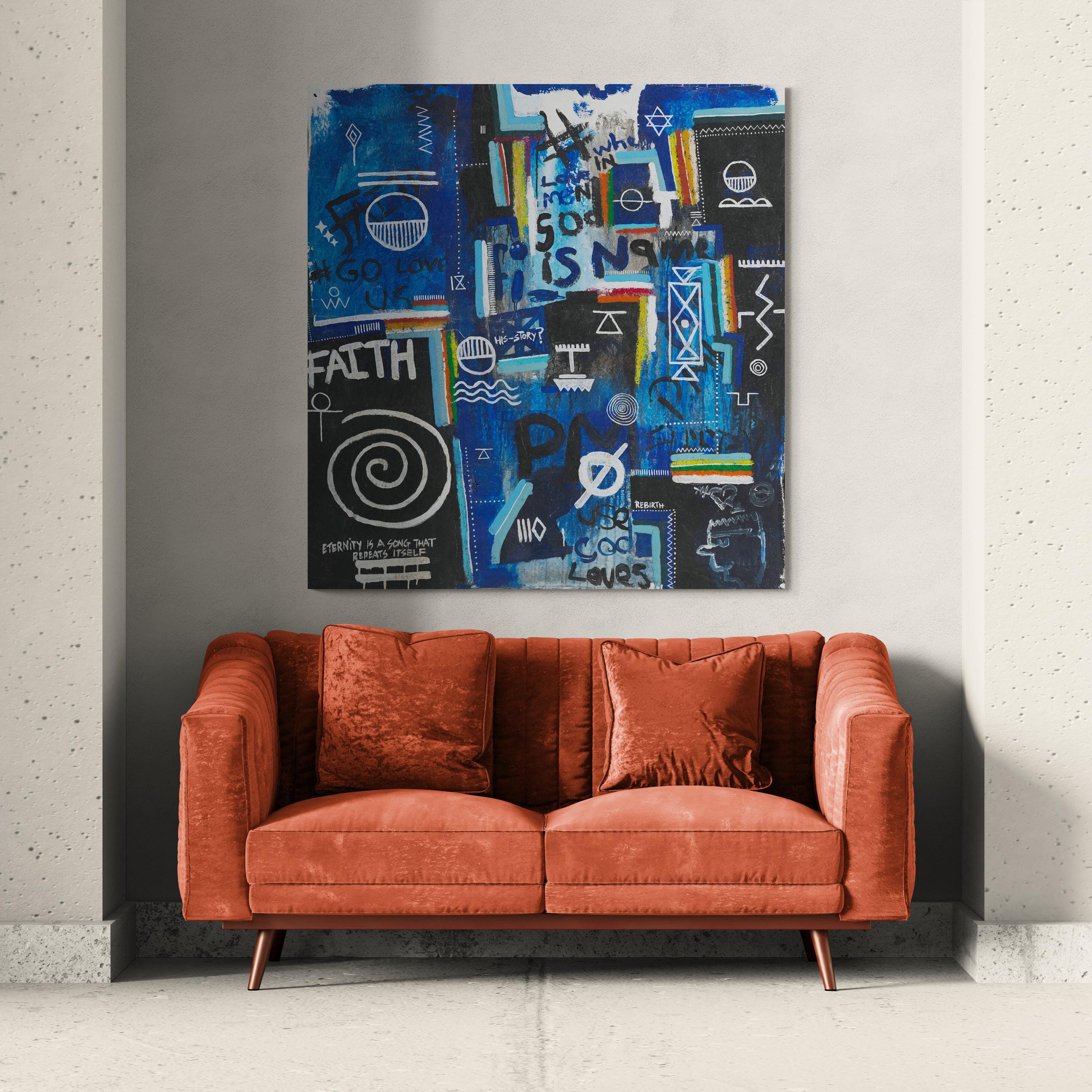 Layered throughout the composition are universal religious and spiritual symbols, woven together with fragments of text such as “faith,” “rebirth,” and “God loves us all.” Rather than presenting a singular doctrine, the piece reflects a convergence of belief systems, pointing to a deeper, collective truth: that love, meaning, and connection exist across cultures, languages, and generations. The visual language; at once chaotic and intentional, mirrors the complexity of human thought while anchoring itself in a quiet, unifying message of divine presence within everyday life.