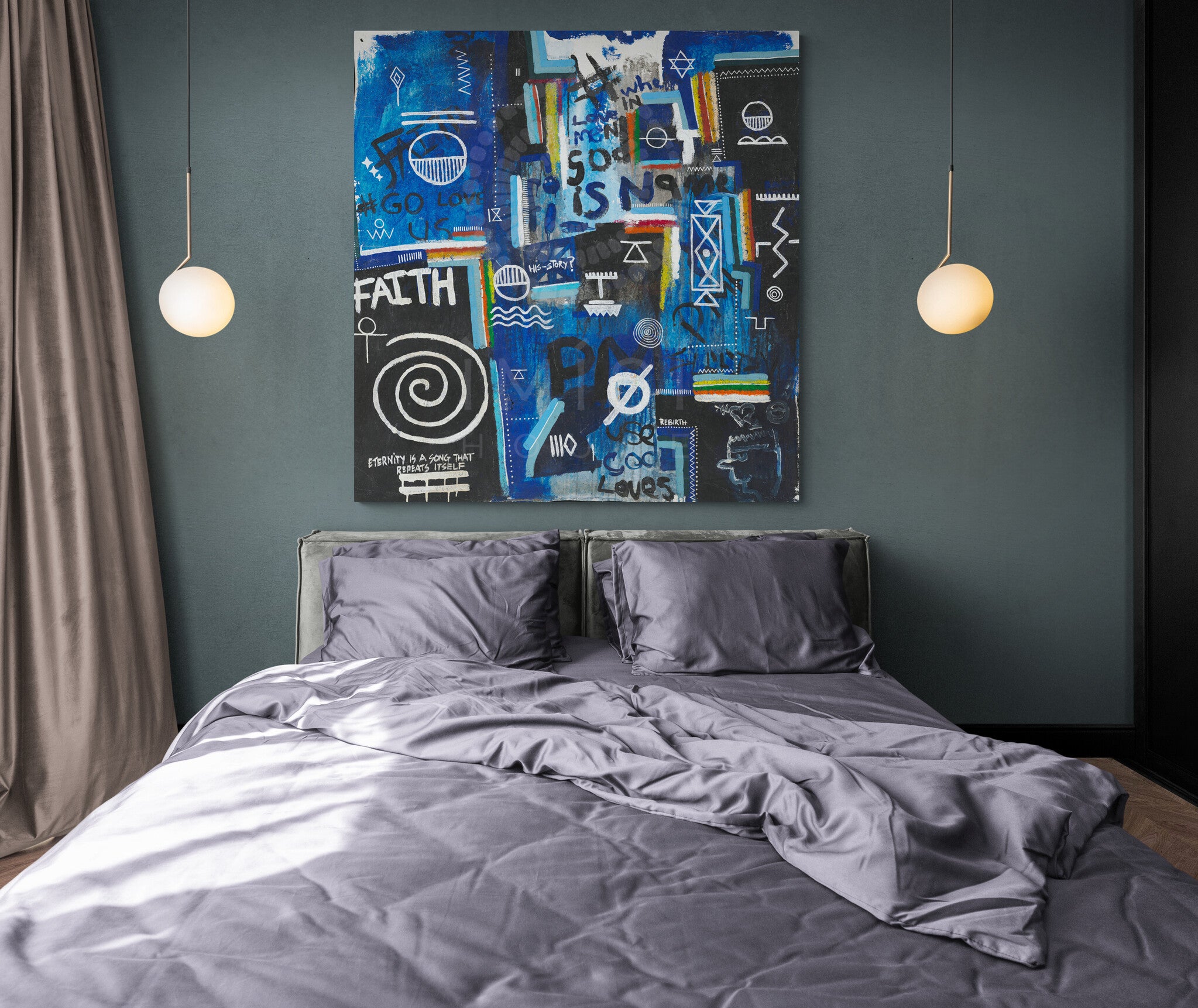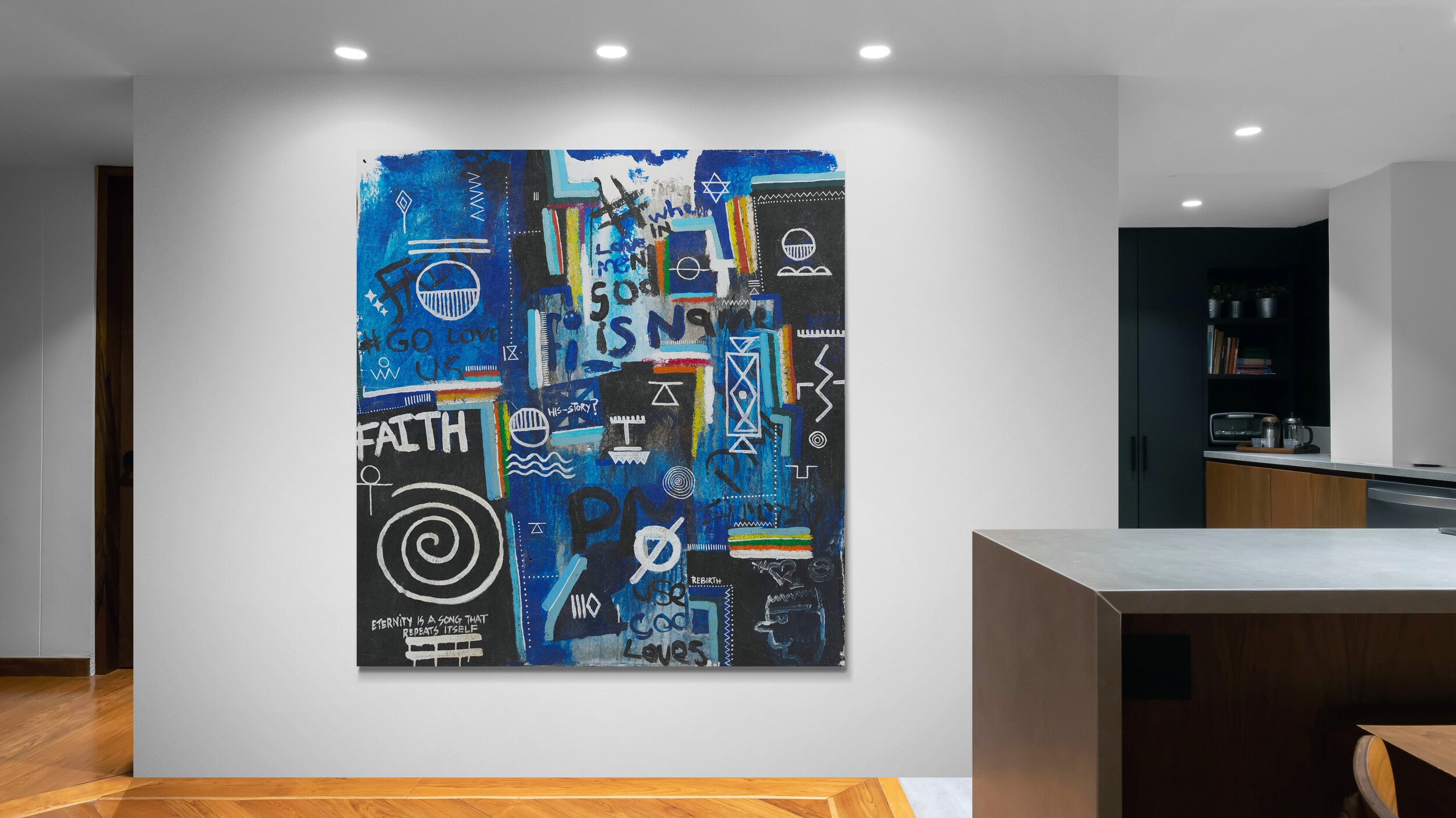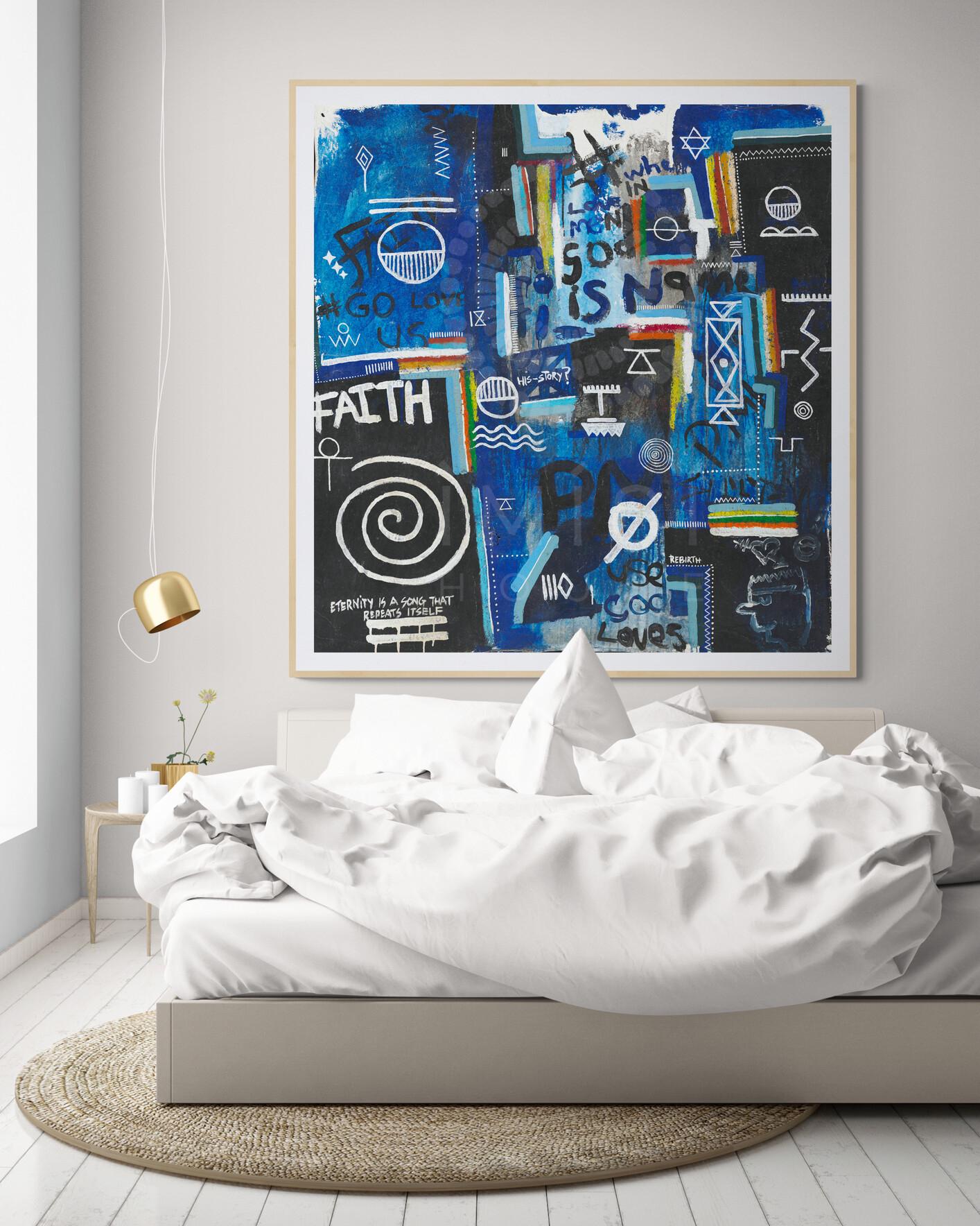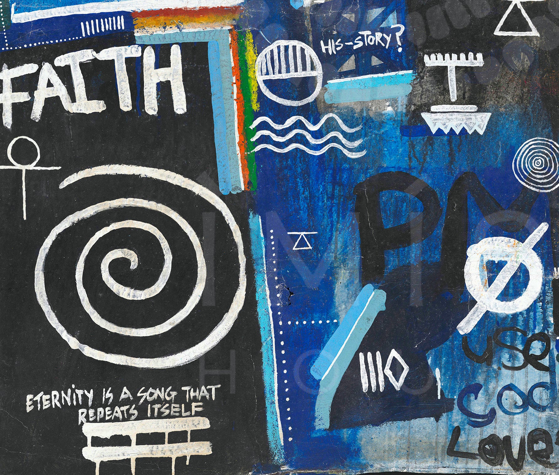 Layered throughout the composition are universal religious and spiritual symbols, woven together with fragments of text such as “faith,” “rebirth,” and “God loves us all.” Rather than presenting a singular doctrine, the piece reflects a convergence of belief systems, pointing to a deeper, collective truth: that love, meaning, and connection exist across cultures, languages, and generations. The visual language; at once chaotic and intentional, mirrors the complexity of human thought while anchoring itself in a quiet, unifying message of divine presence within everyday life.