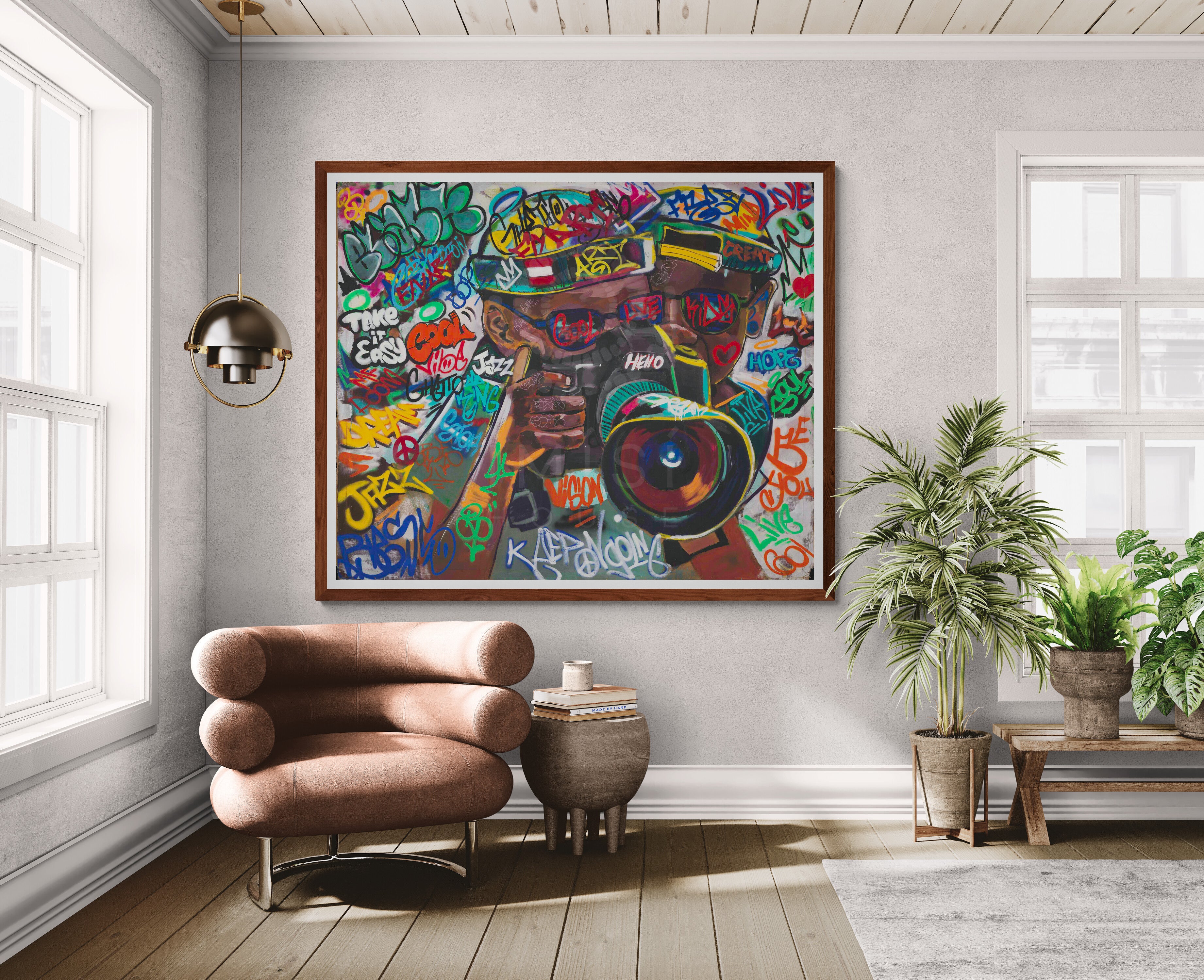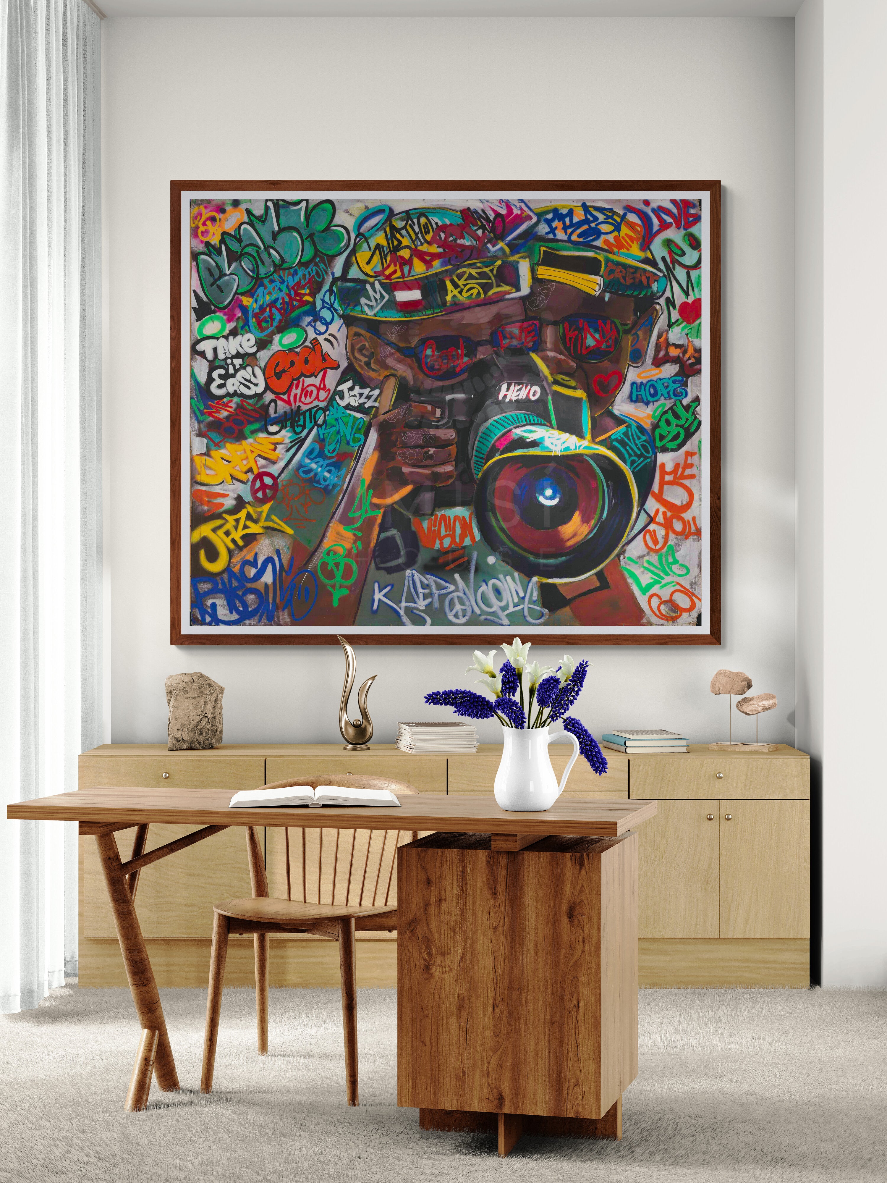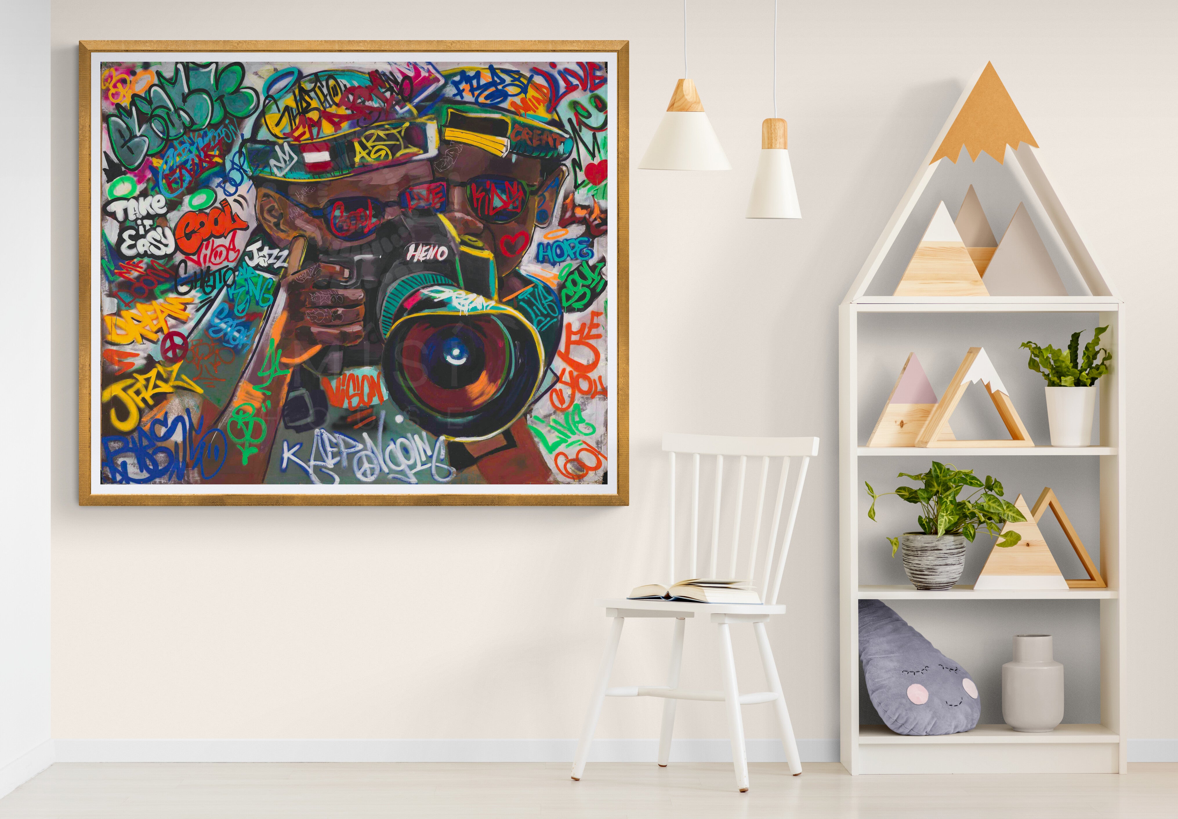 This is a canvas print version of the original painting "It’s Never Too Young to Dream Big" by Black Mabutho. This piece is an explosion of raw energy, a layered fusion of graffiti, portraiture, and cultural emblem that captures the urgency and innocence of youthful ambition. At the center stands two young figures, faces partially obscured by a camera, both shield and lens, suggesting a dual identity: observer and creator, witness and storyteller. The camera becomes more than a tool; it is a declaration of perspective, a claim to visibility in a world that often overlooks emerging voices.
