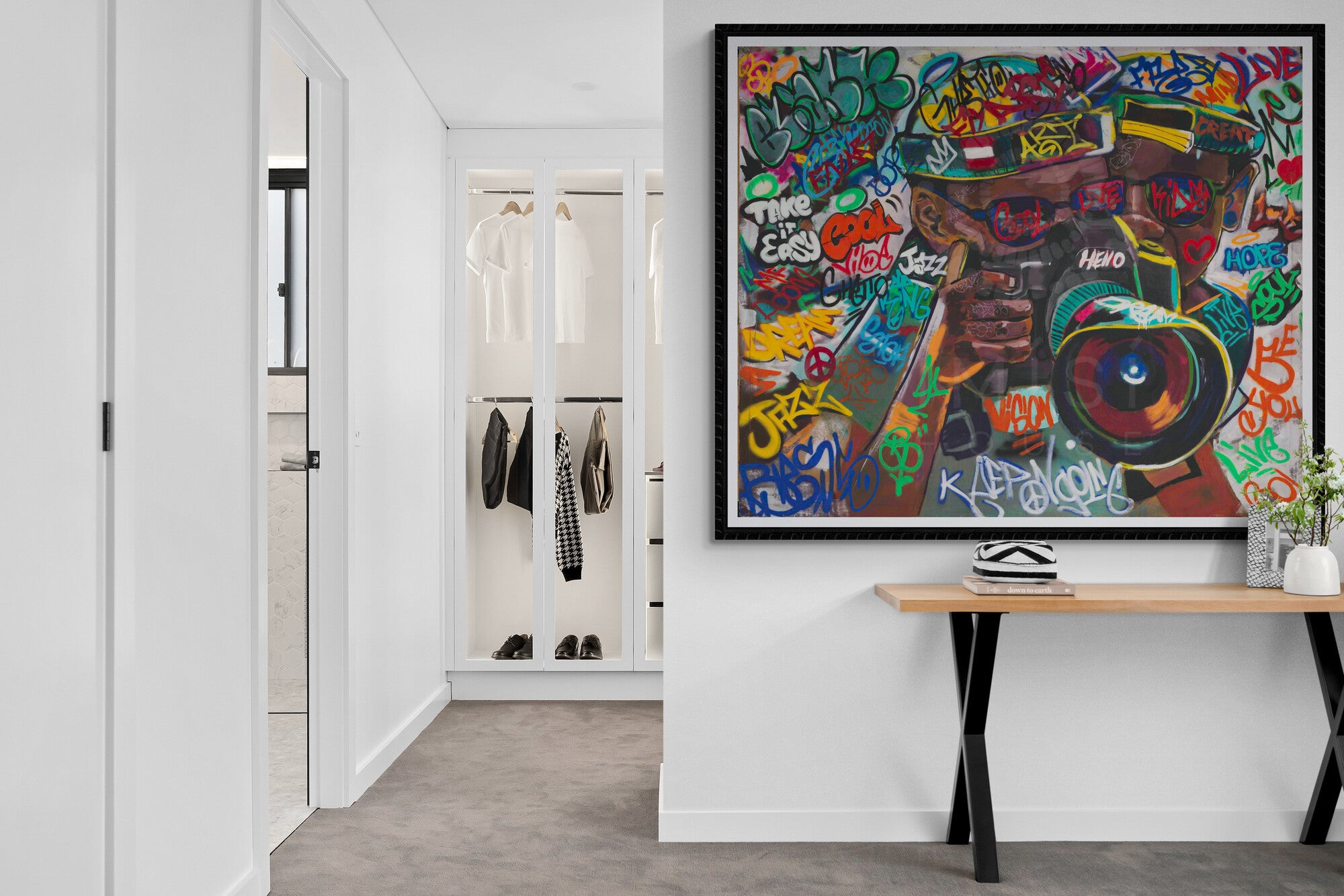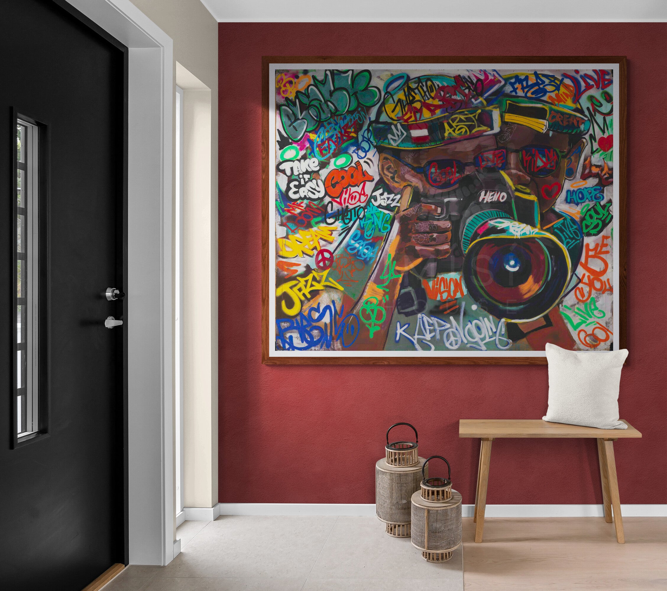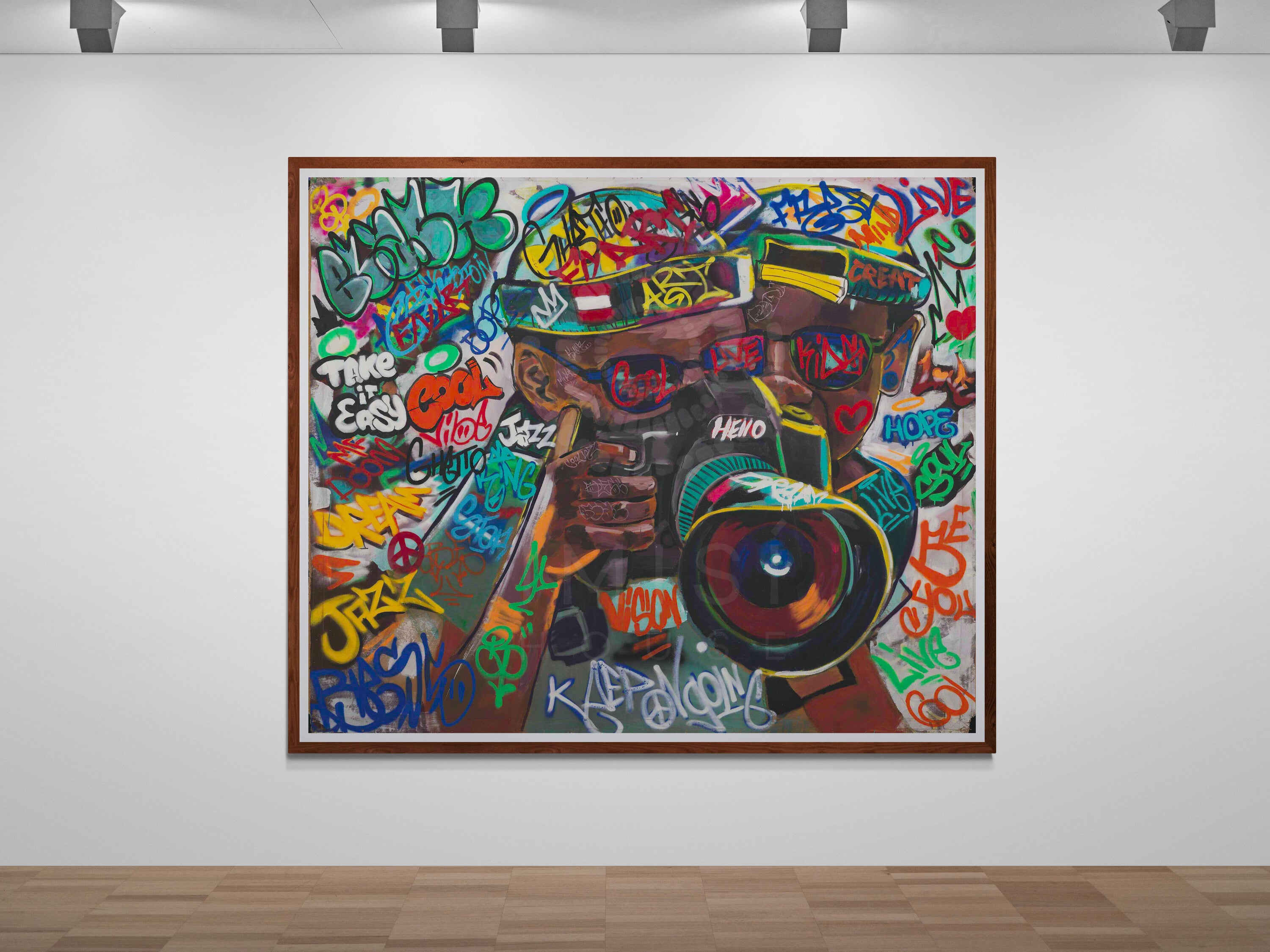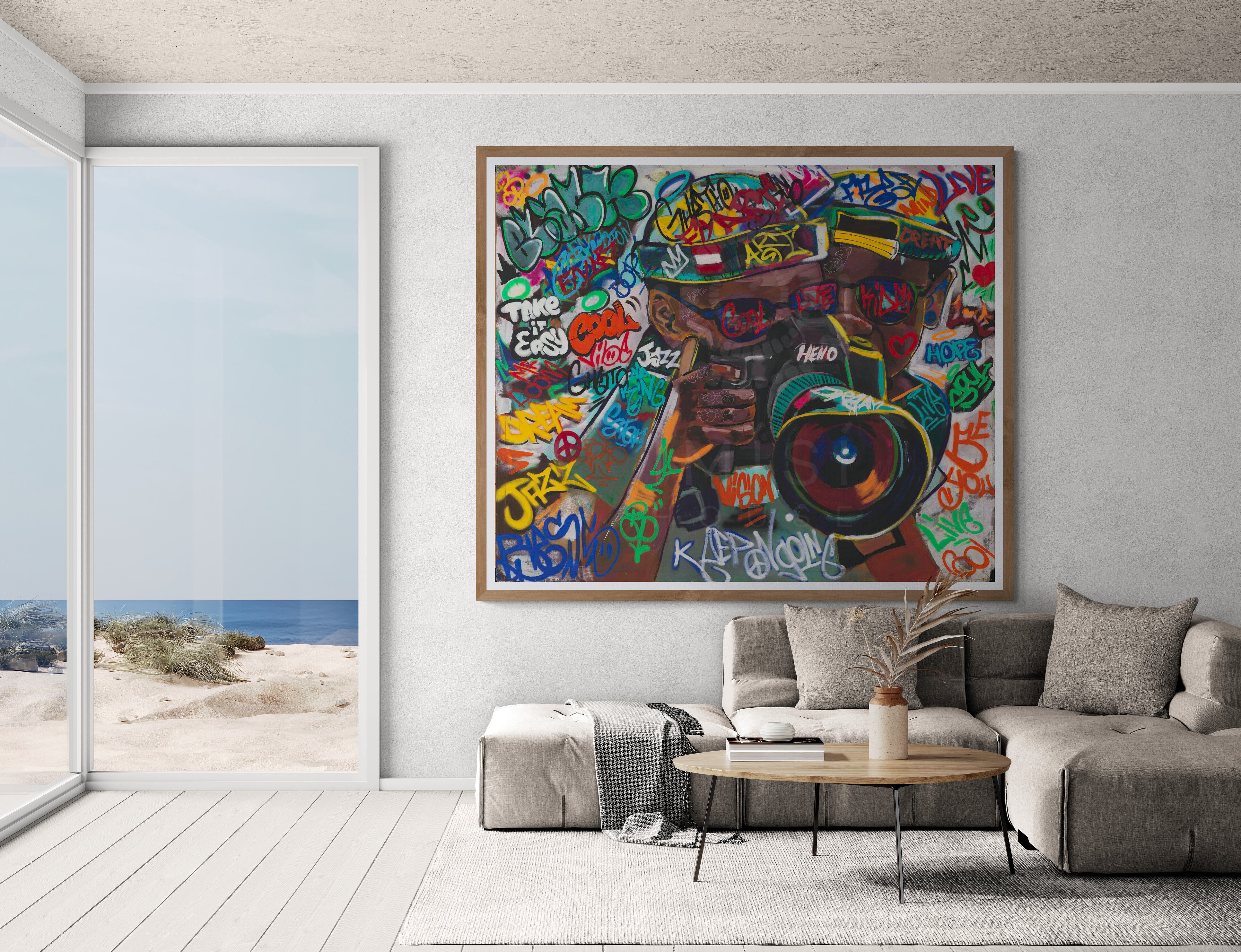 This is a canvas print version of the original painting "It’s Never Too Young to Dream Big" by Black Mabutho. This piece is an explosion of raw energy, a layered fusion of graffiti, portraiture, and cultural emblem that captures the urgency and innocence of youthful ambition. At the center stands two young figures, faces partially obscured by a camera, both shield and lens, suggesting a dual identity: observer and creator, witness and storyteller. The camera becomes more than a tool; it is a declaration of perspective, a claim to visibility in a world that often overlooks emerging voices.