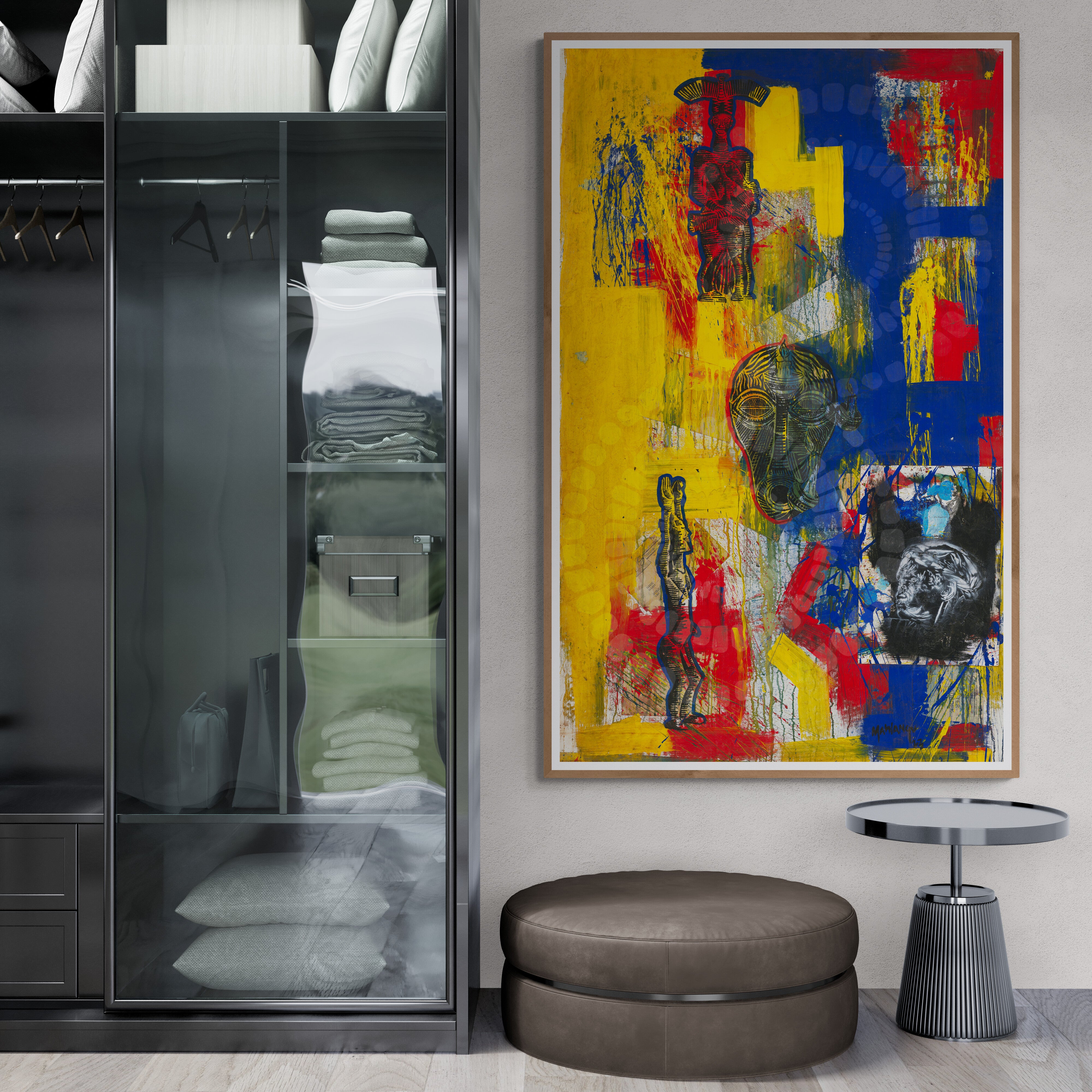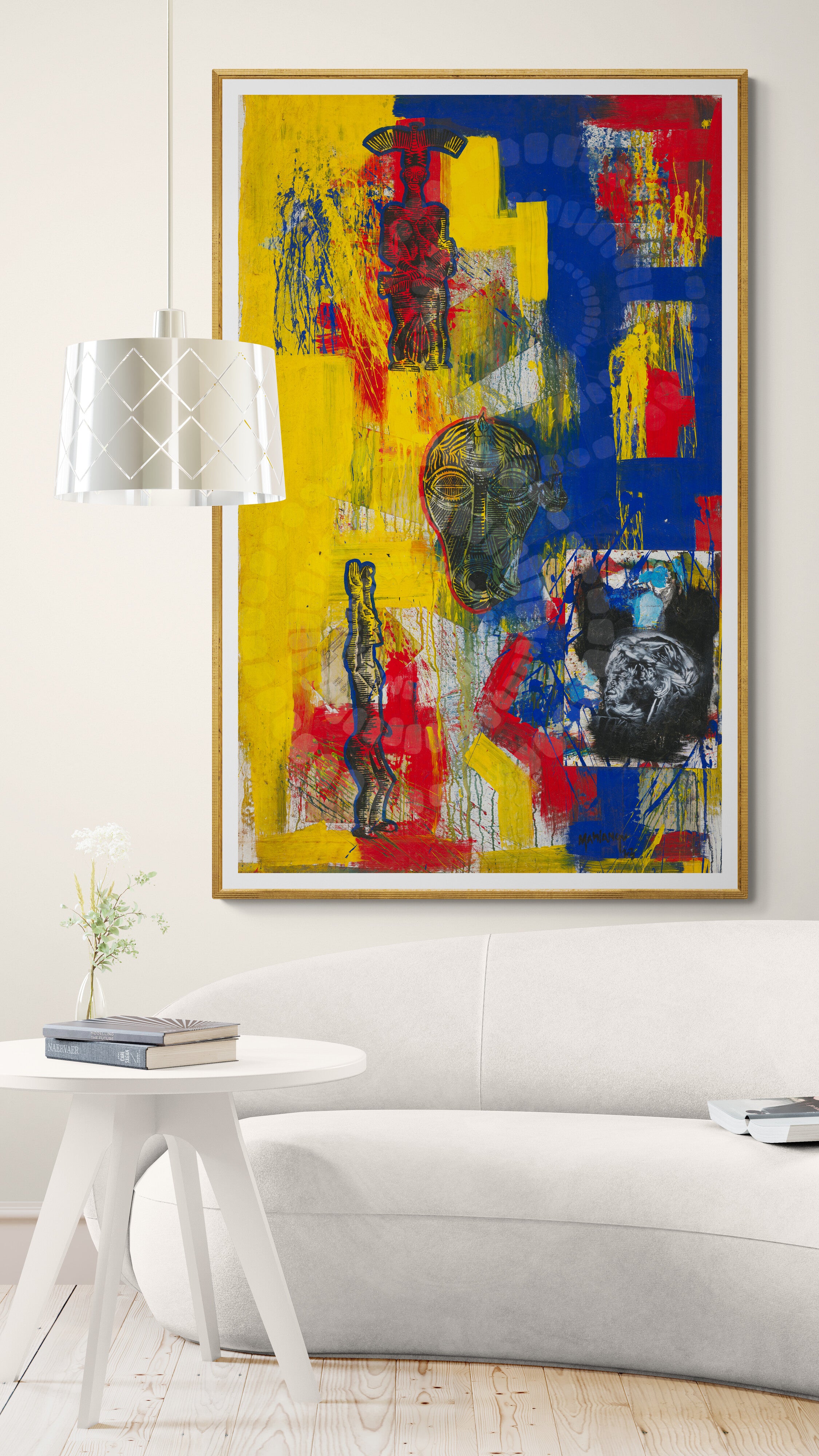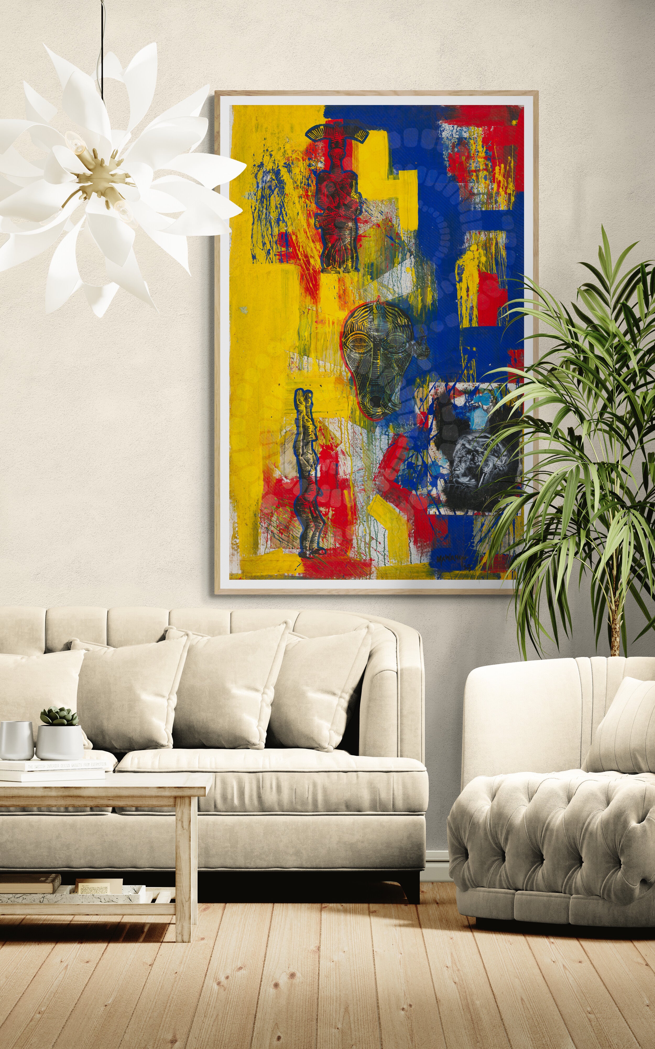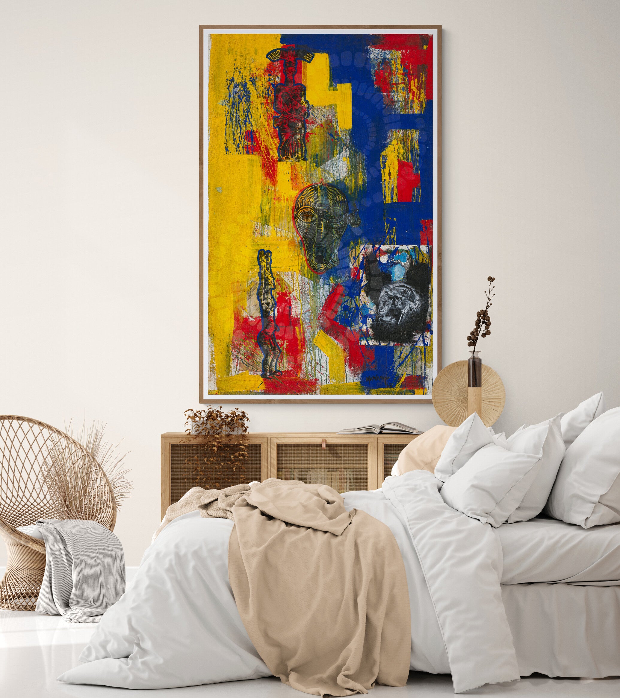 This is a canvas print version of the original painting "Sacred Rituals II” by Nkululeko Mahlangu. This piece reflects on indigenous spiritual traditions across the African continent that have shaped community life for generations. Through layered imagery, symbolic forms, and vibrant color, the work evokes ancestral practices that connect identity, memory, and belonging.