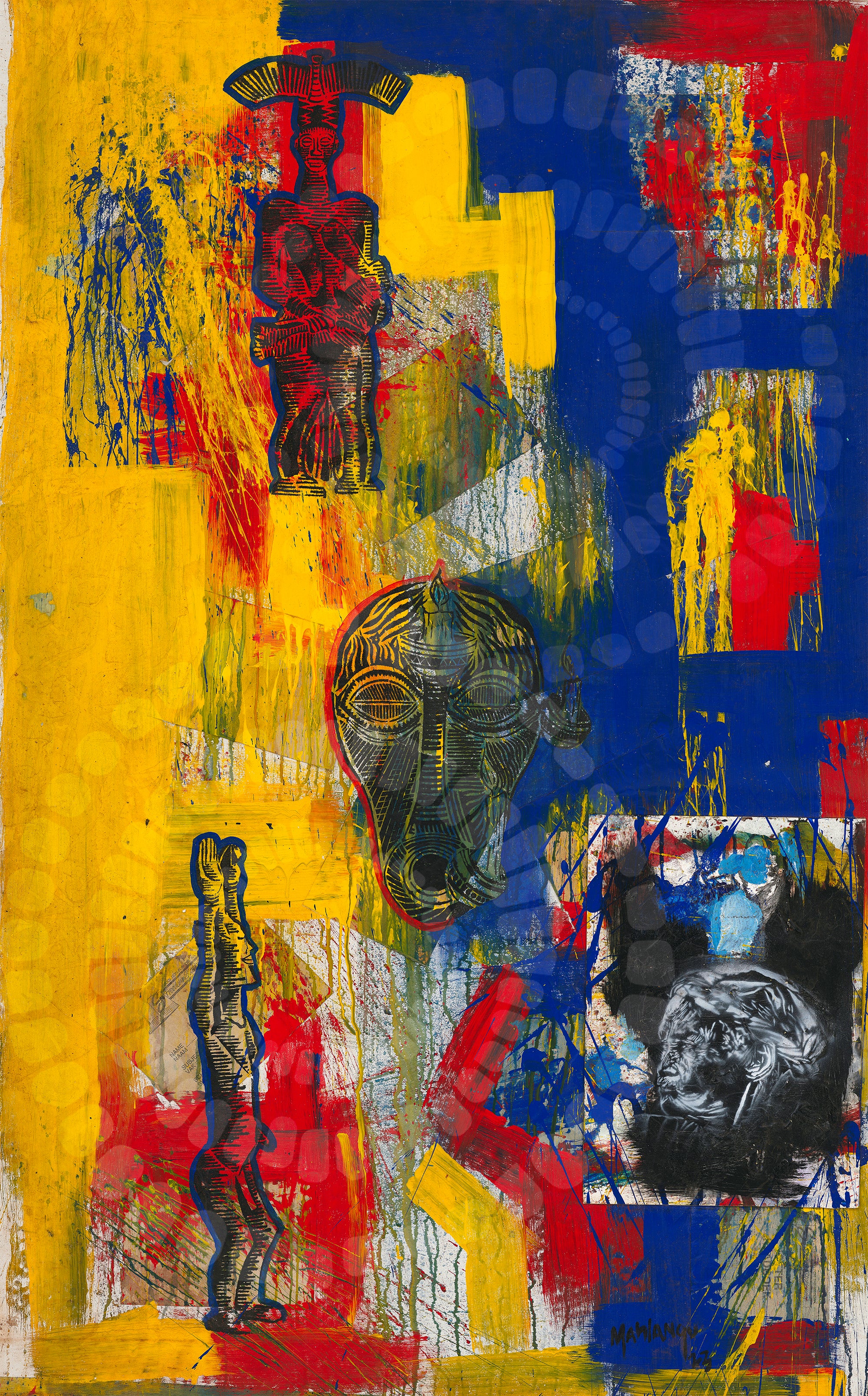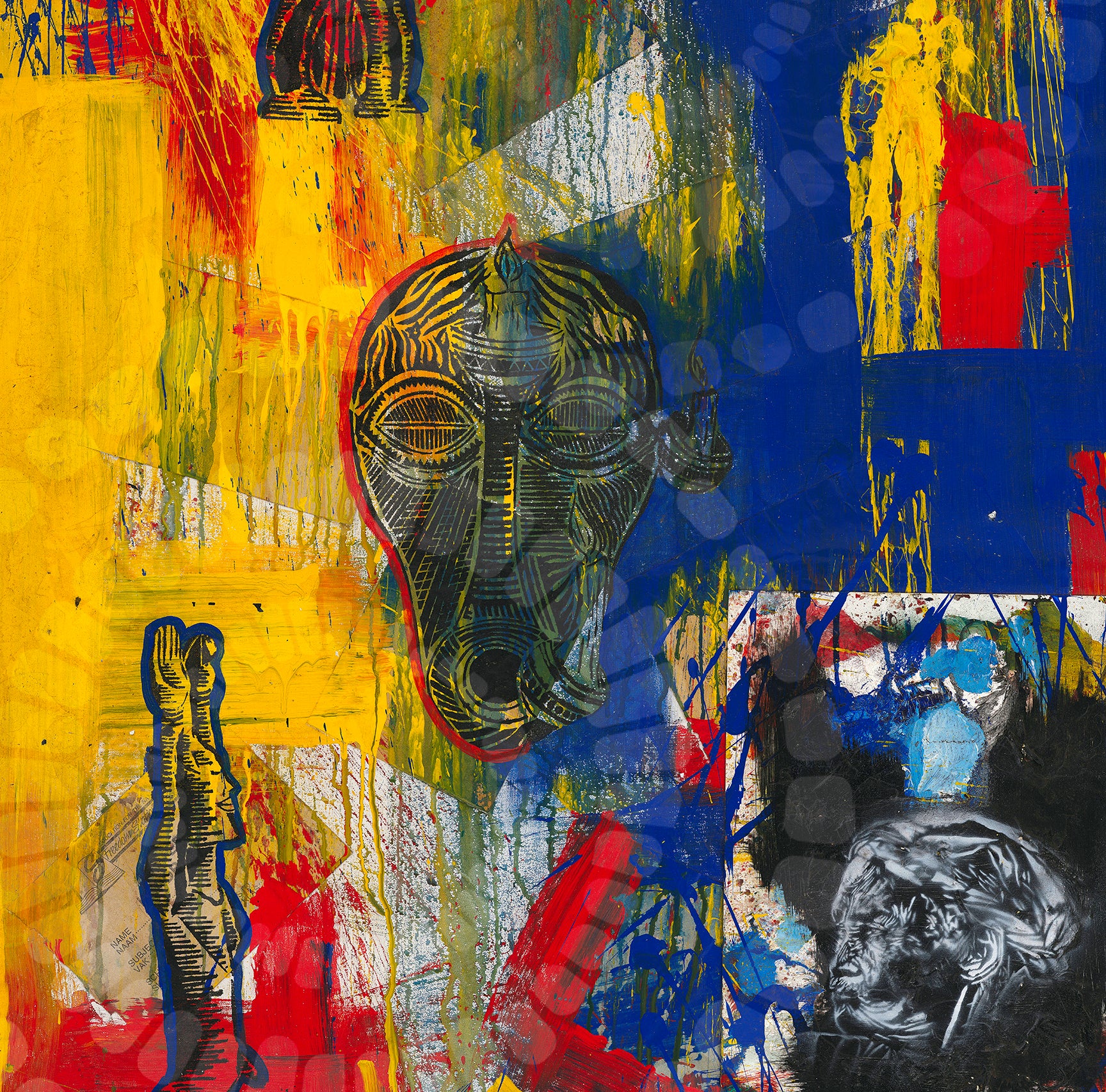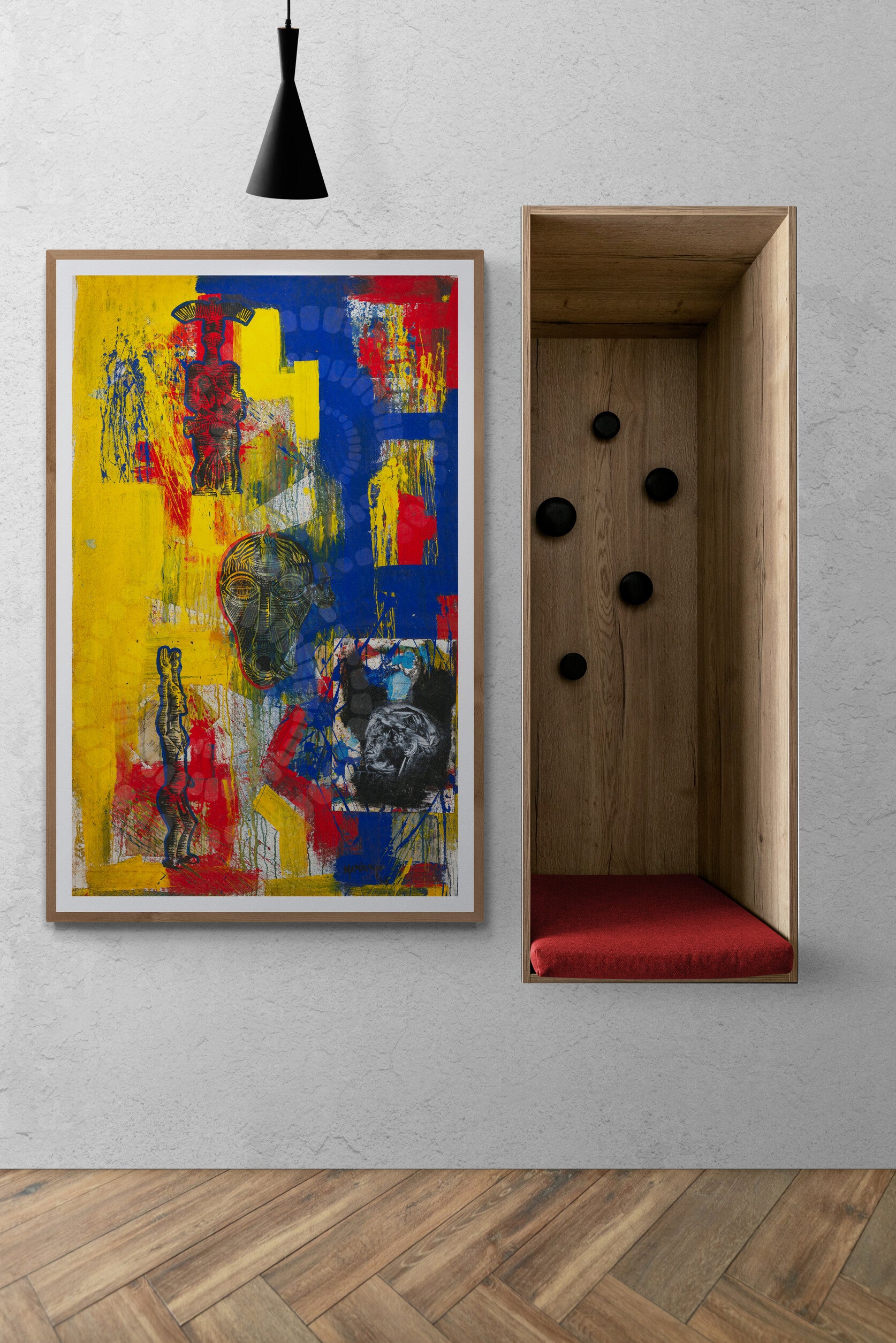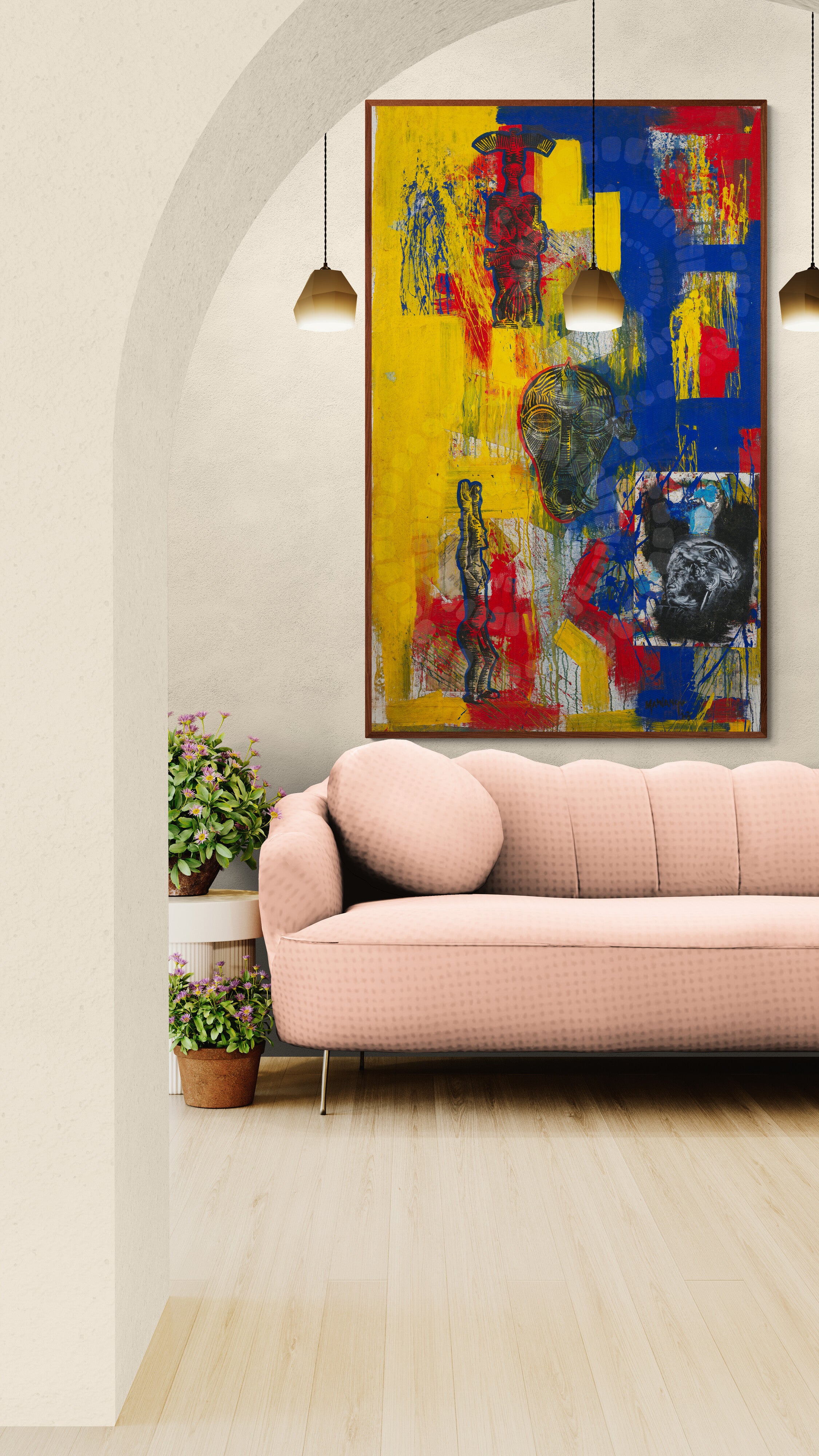 This is a canvas print version of the original painting "Sacred Rituals II” by Nkululeko Mahlangu. This piece reflects on indigenous spiritual traditions across the African continent that have shaped community life for generations. Through layered imagery, symbolic forms, and vibrant color, the work evokes ancestral practices that connect identity, memory, and belonging.