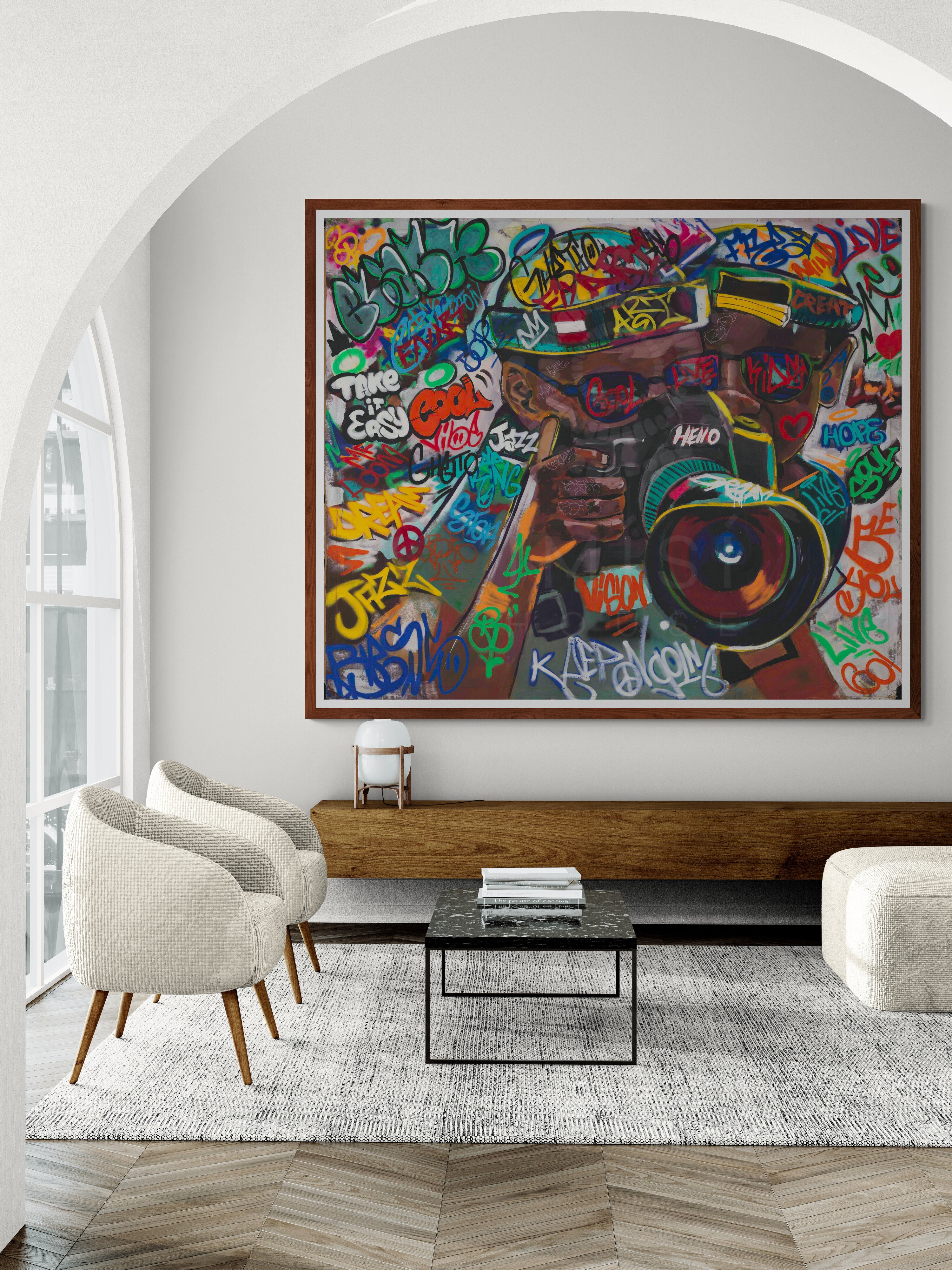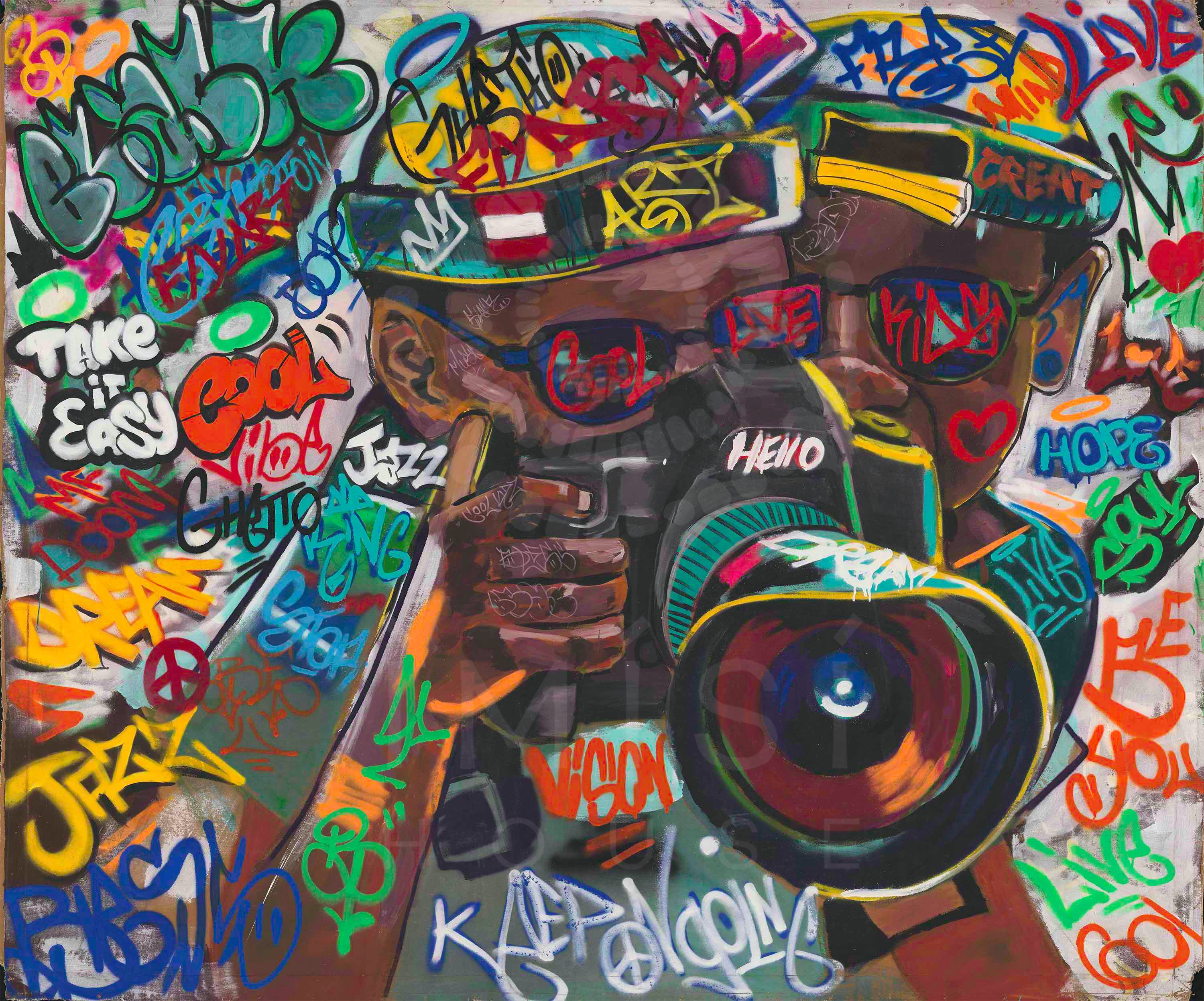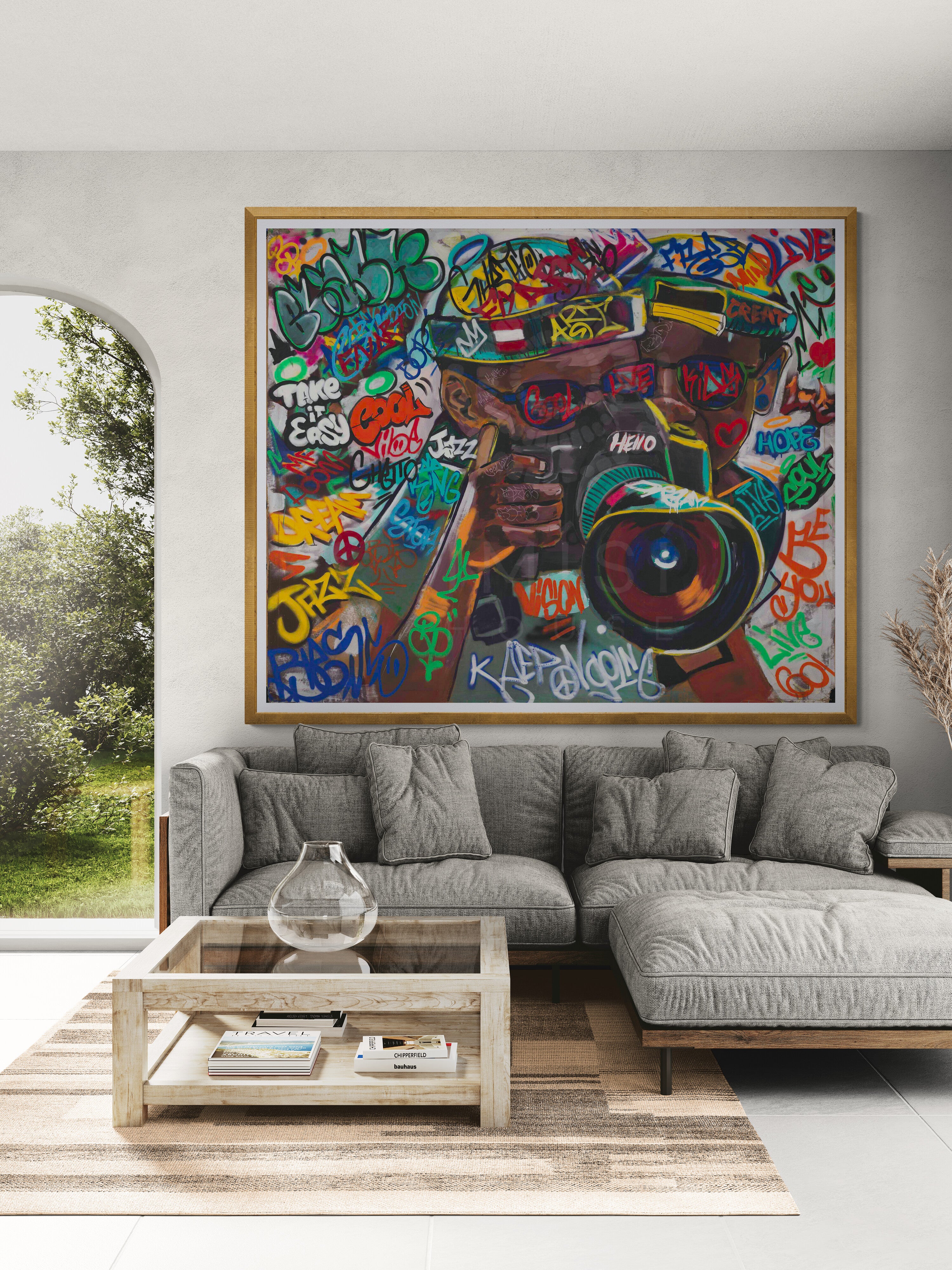 This piece is an explosion of raw energy, a layered fusion of graffiti, portraiture, and cultural emblem that captures the urgency and innocence of youthful ambition. At the center stands two young figures, faces partially obscured by a camera, both shield and lens, suggesting a dual identity: observer and creator, witness and storyteller. The camera becomes more than a tool; it is a declaration of perspective, a claim to visibility in a world that often overlooks emerging voices.
