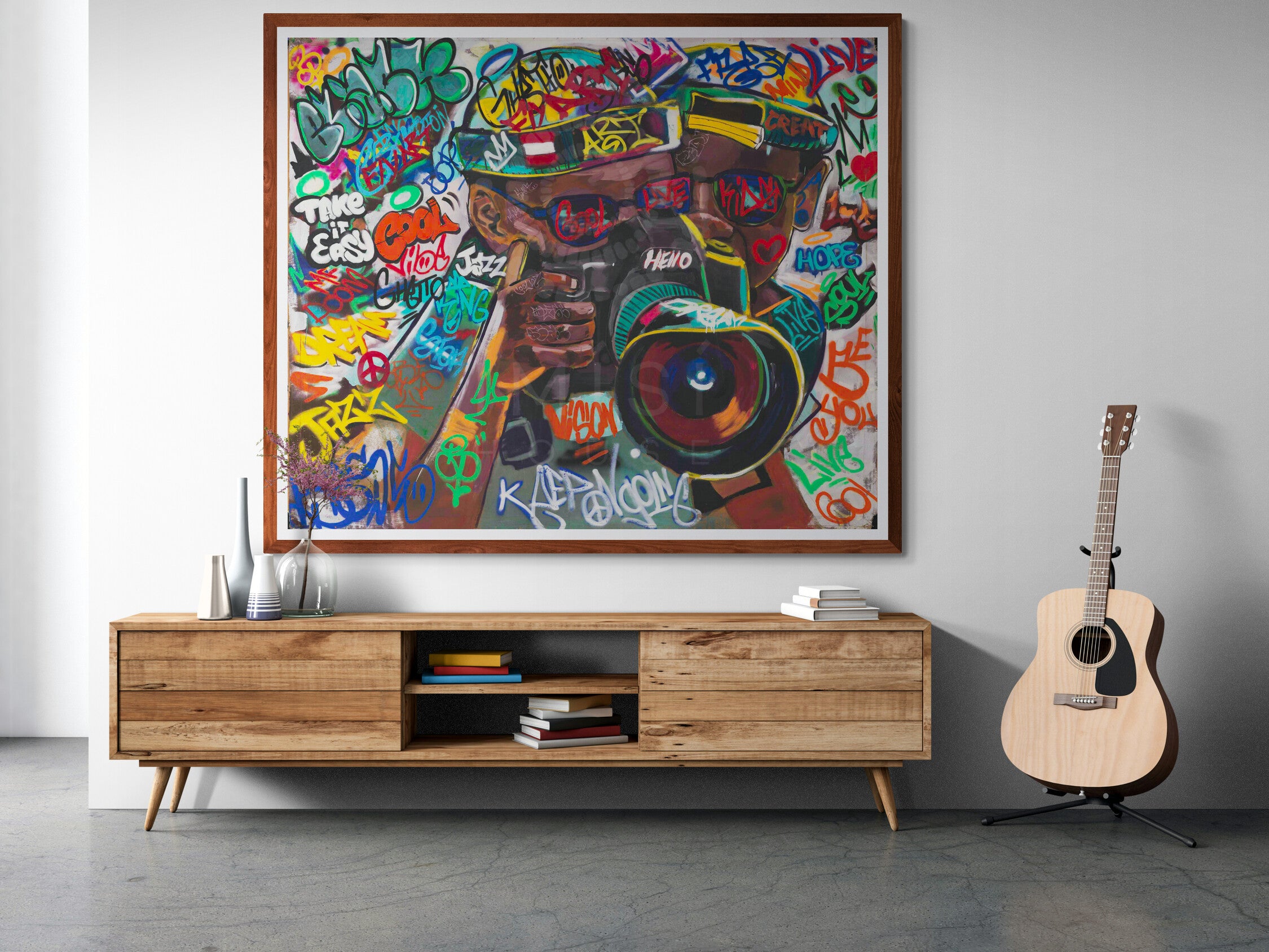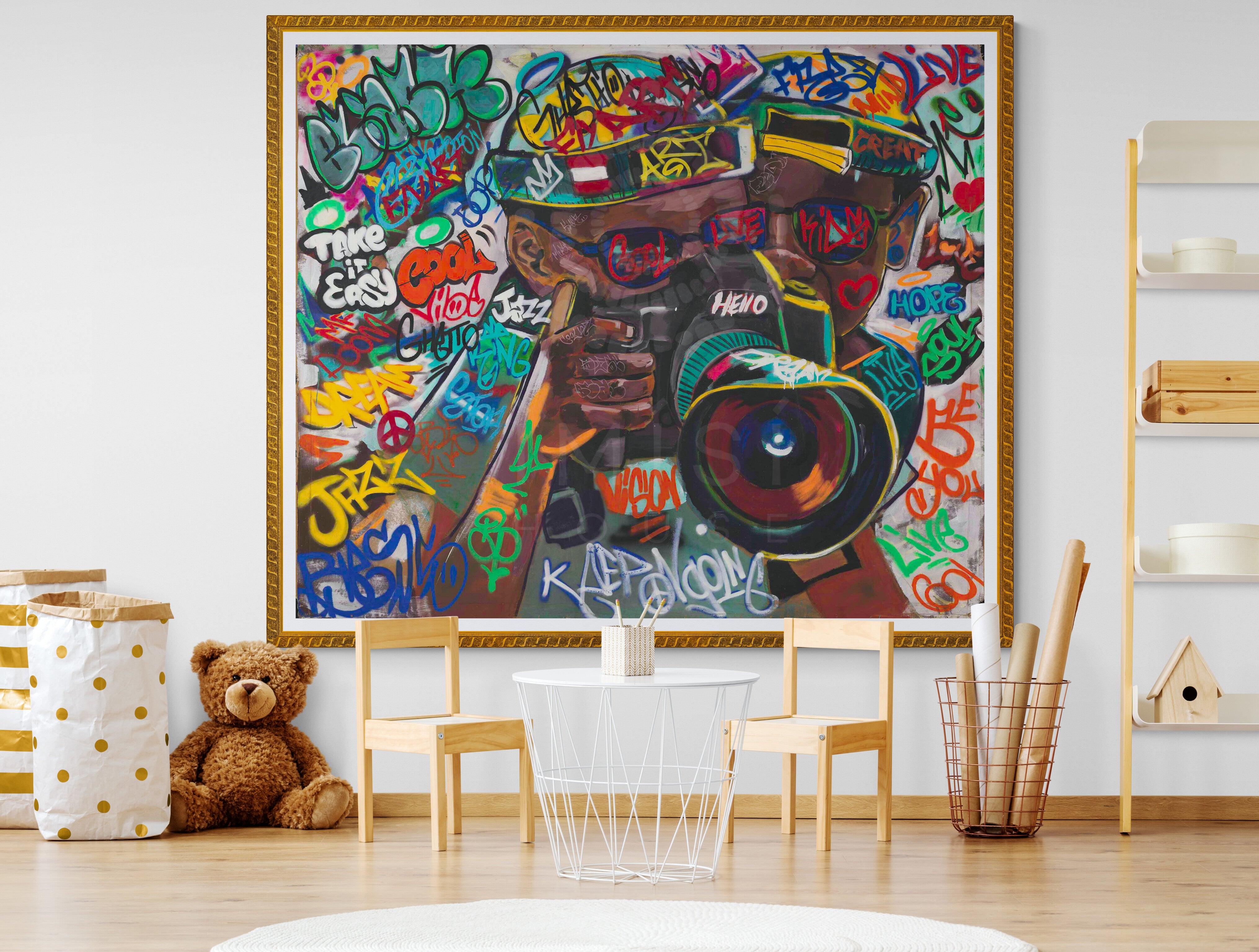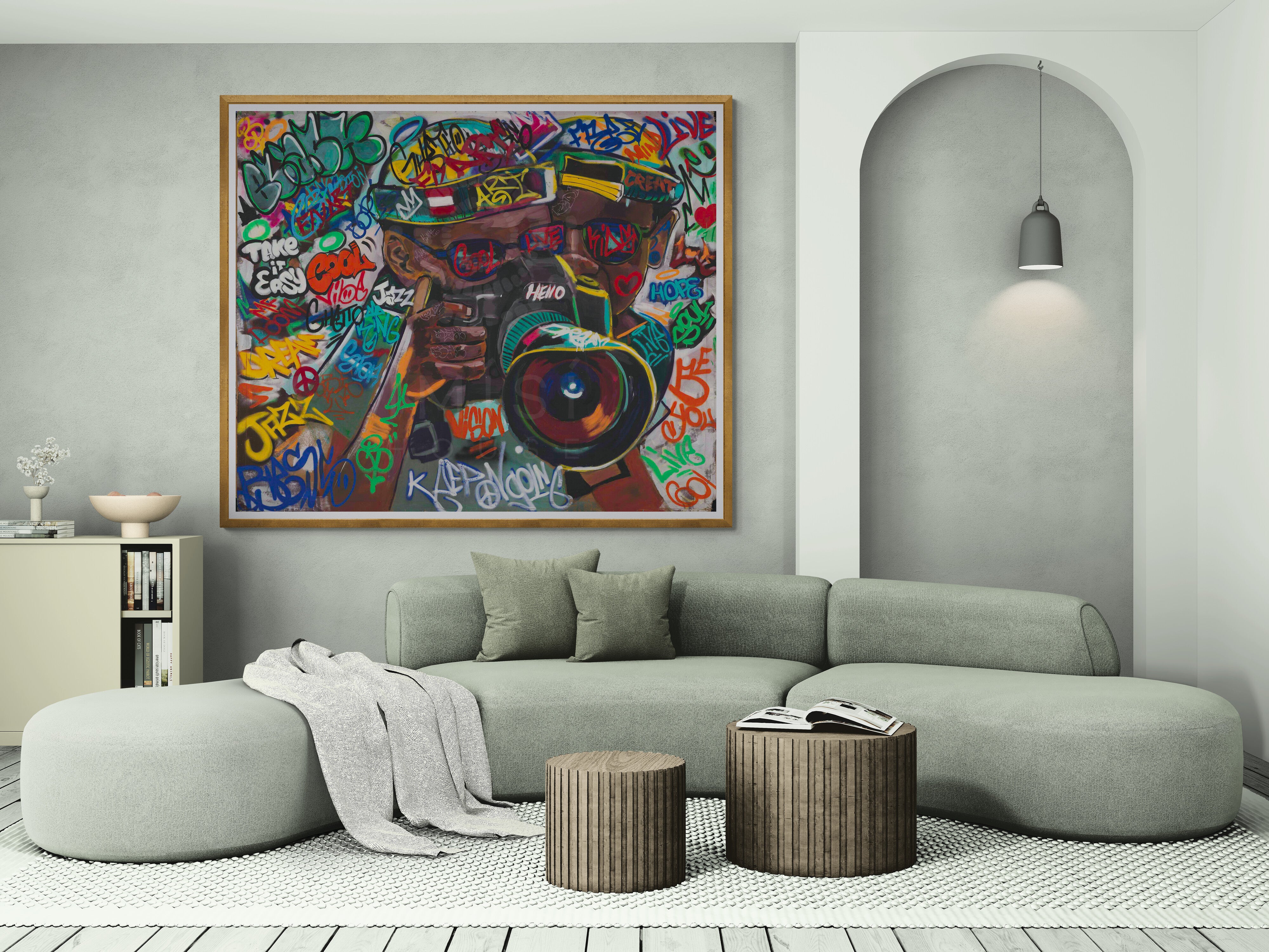 This piece is an explosion of raw energy, a layered fusion of graffiti, portraiture, and cultural emblem that captures the urgency and innocence of youthful ambition. At the center stands two young figures, faces partially obscured by a camera, both shield and lens, suggesting a dual identity: observer and creator, witness and storyteller. The camera becomes more than a tool; it is a declaration of perspective, a claim to visibility in a world that often overlooks emerging voices.