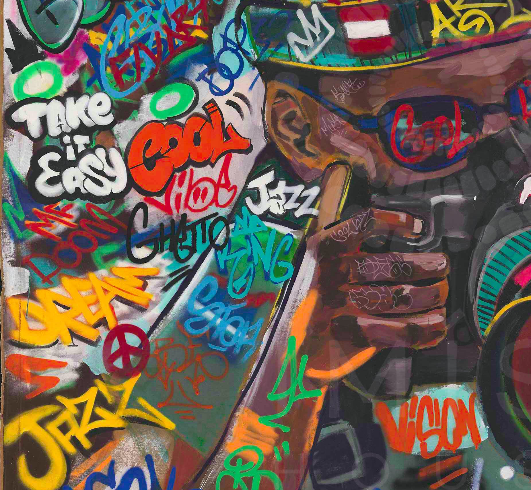The composition is saturated with vibrant tags, symbols, and fragmented words: “cool,” “hope,” “dream,” “take it easy” each one echoing the chaotic yet fertile mental landscape of youth. These markings feel like thoughts made visible, a stream of consciousness painted onto the world without restraint. The graffiti aesthetic grounds the work in urban culture, where creativity thrives in defiance of limitation and structure.