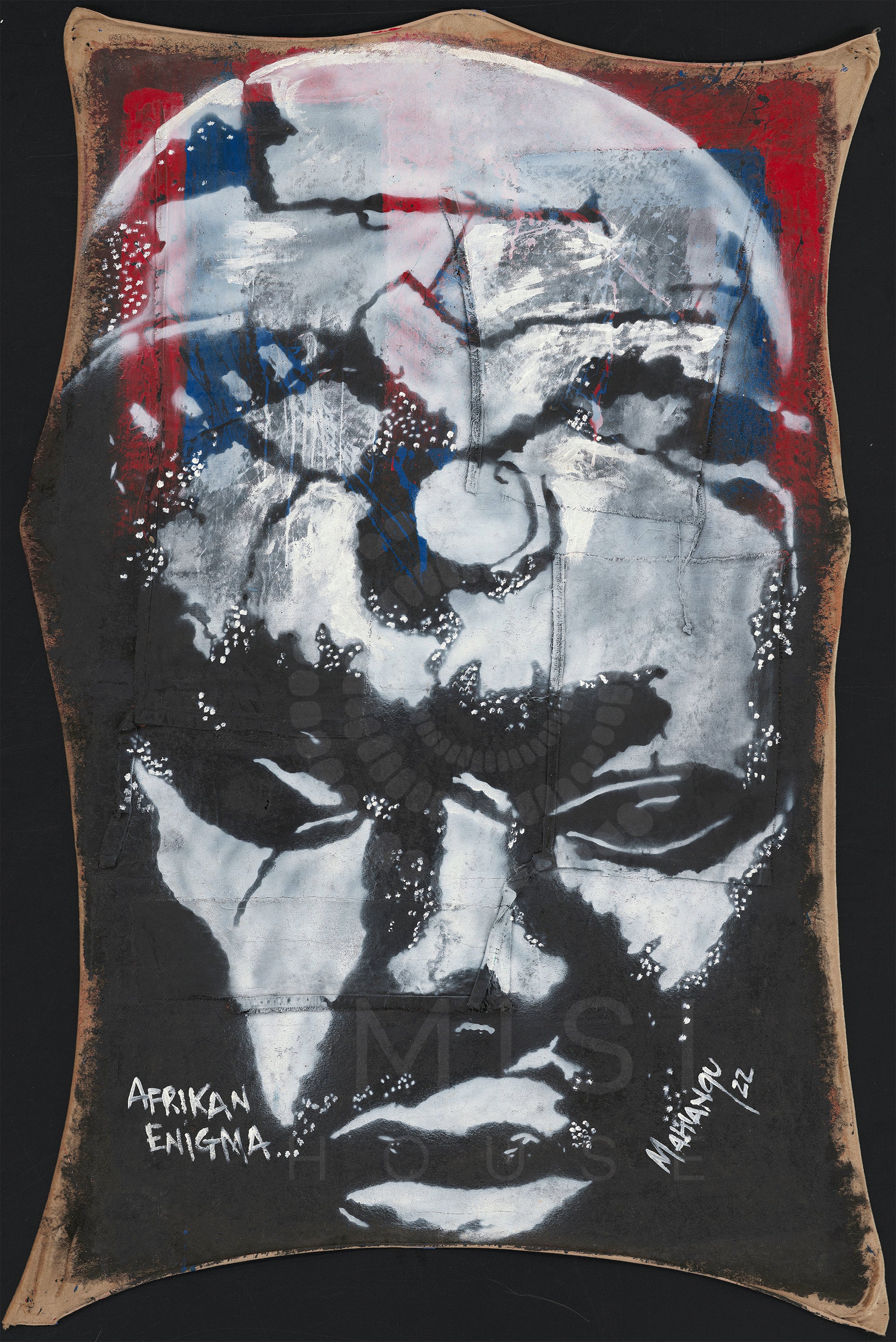 By incorporating denim and acrylic on velvet, the piece bridges past and present, blending contemporary materials with imagery rooted in ancient African civilization. The layered surfaces and fractured textures echo the complexities of history, memory, and identity.