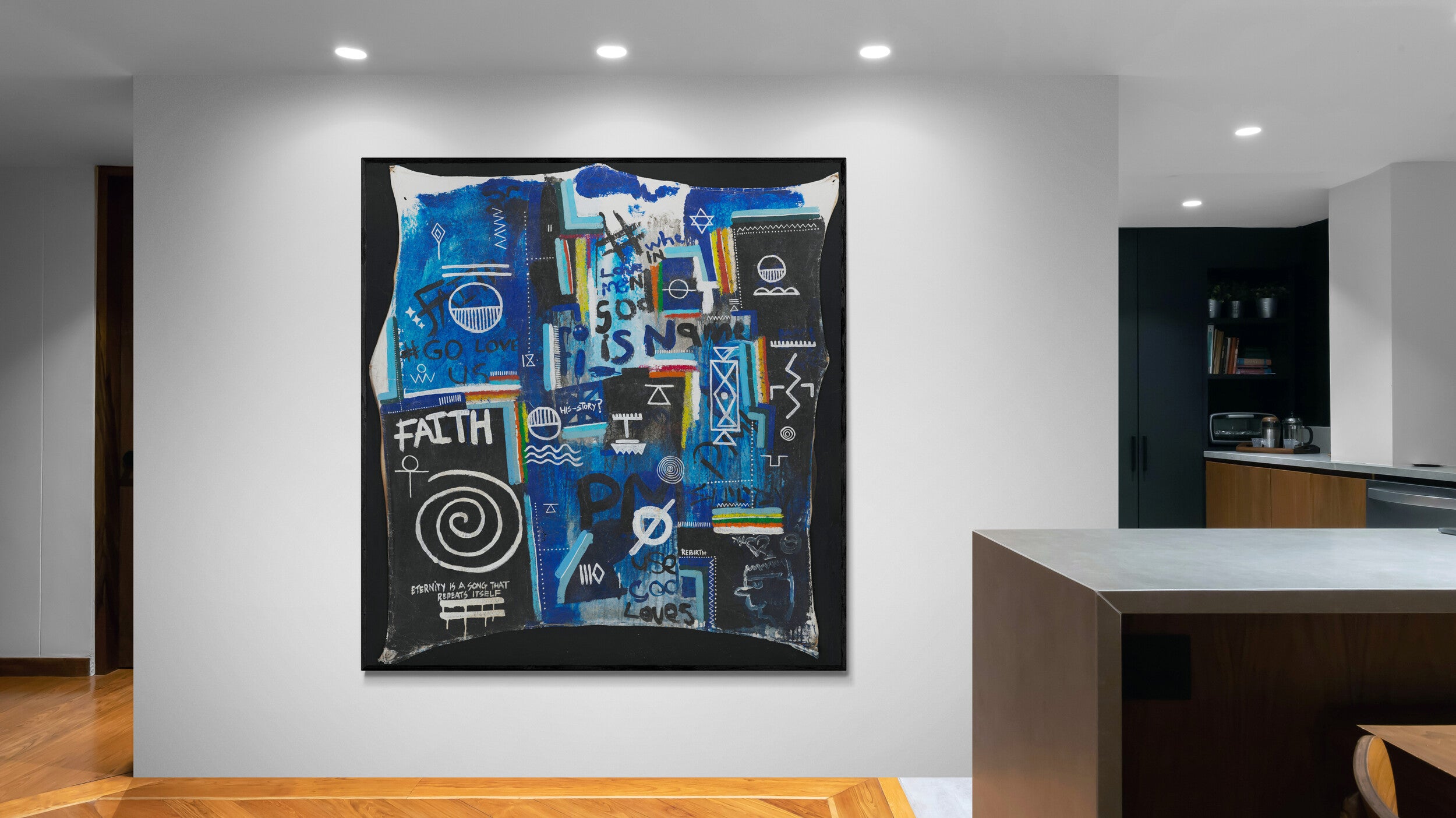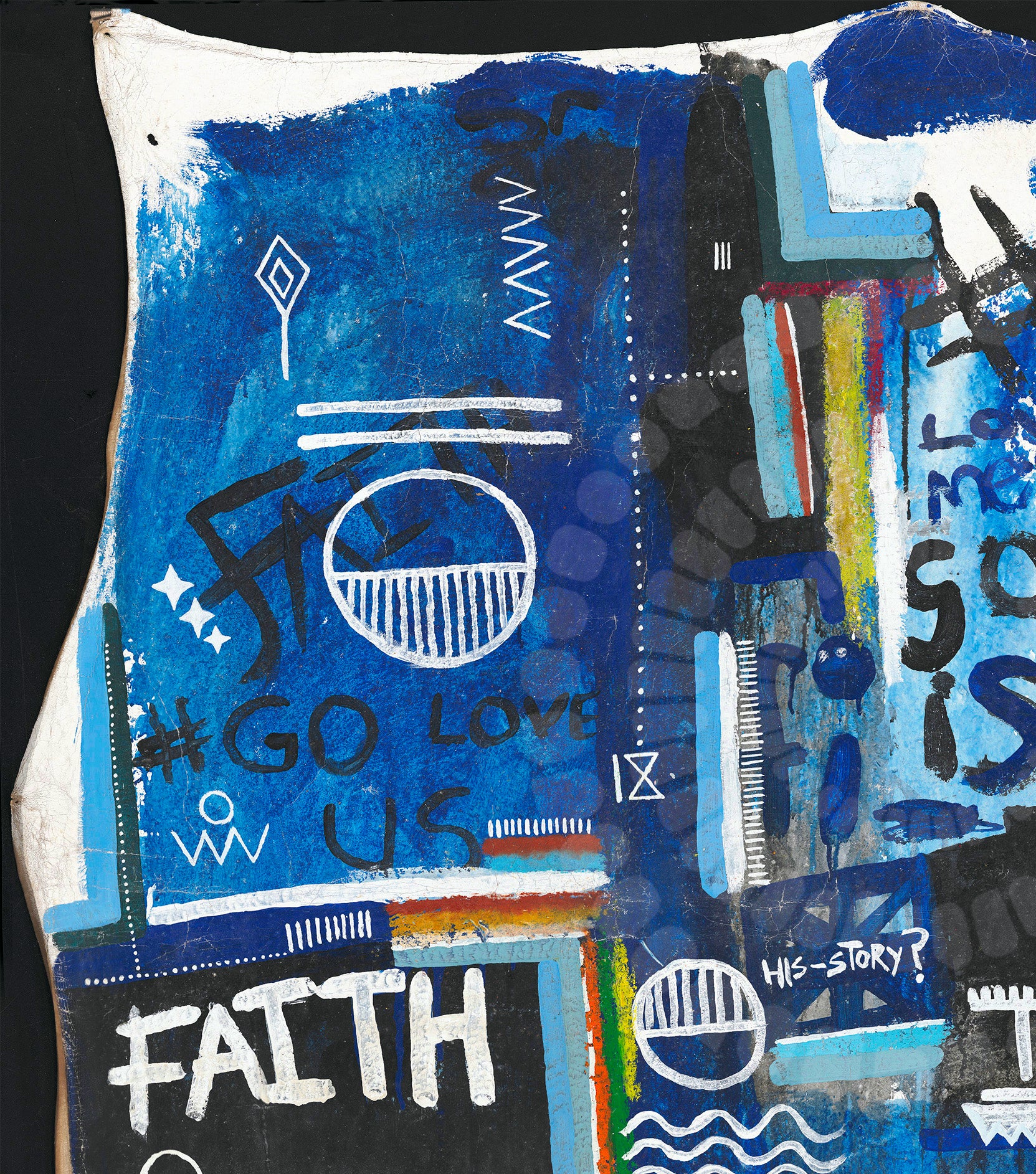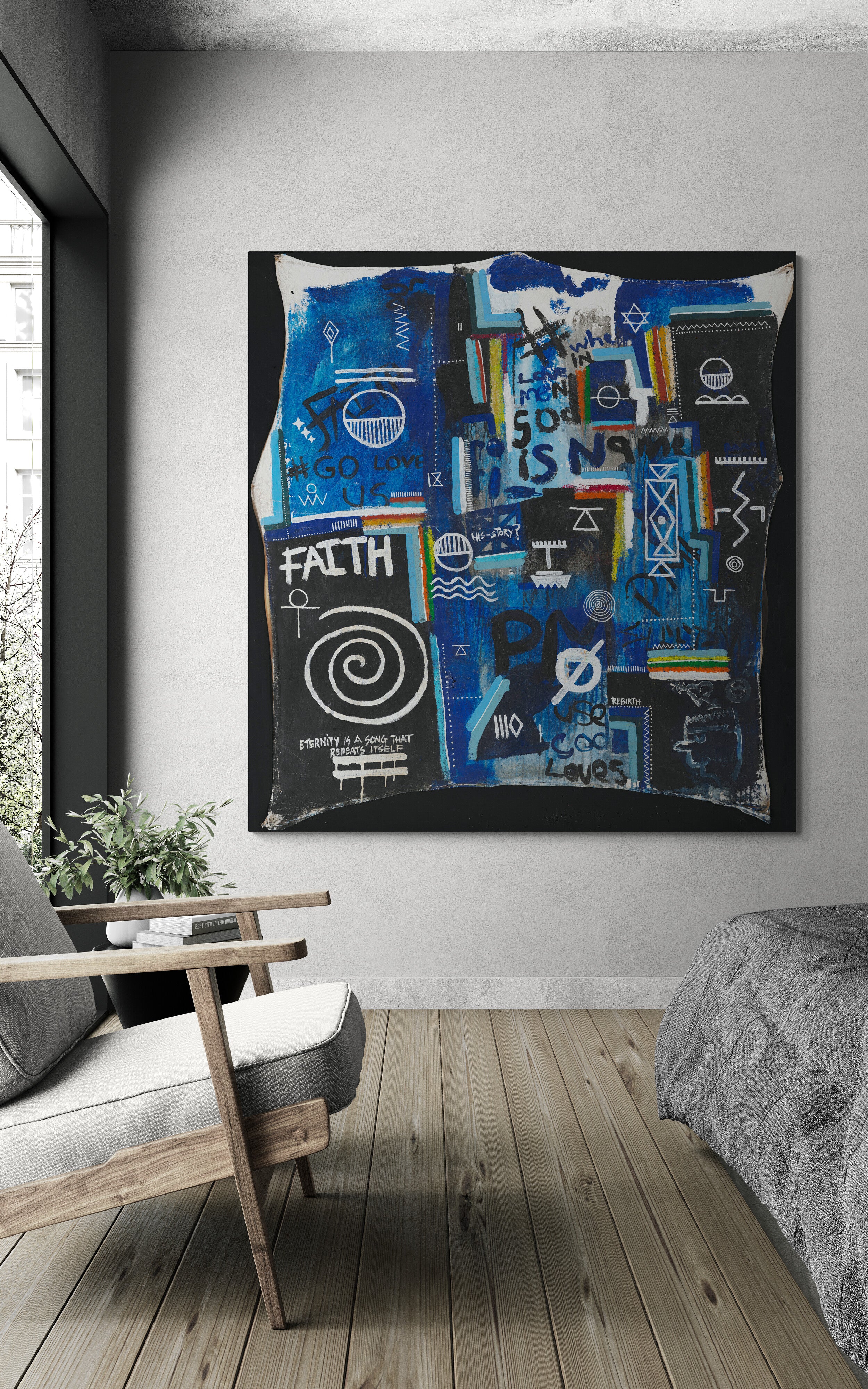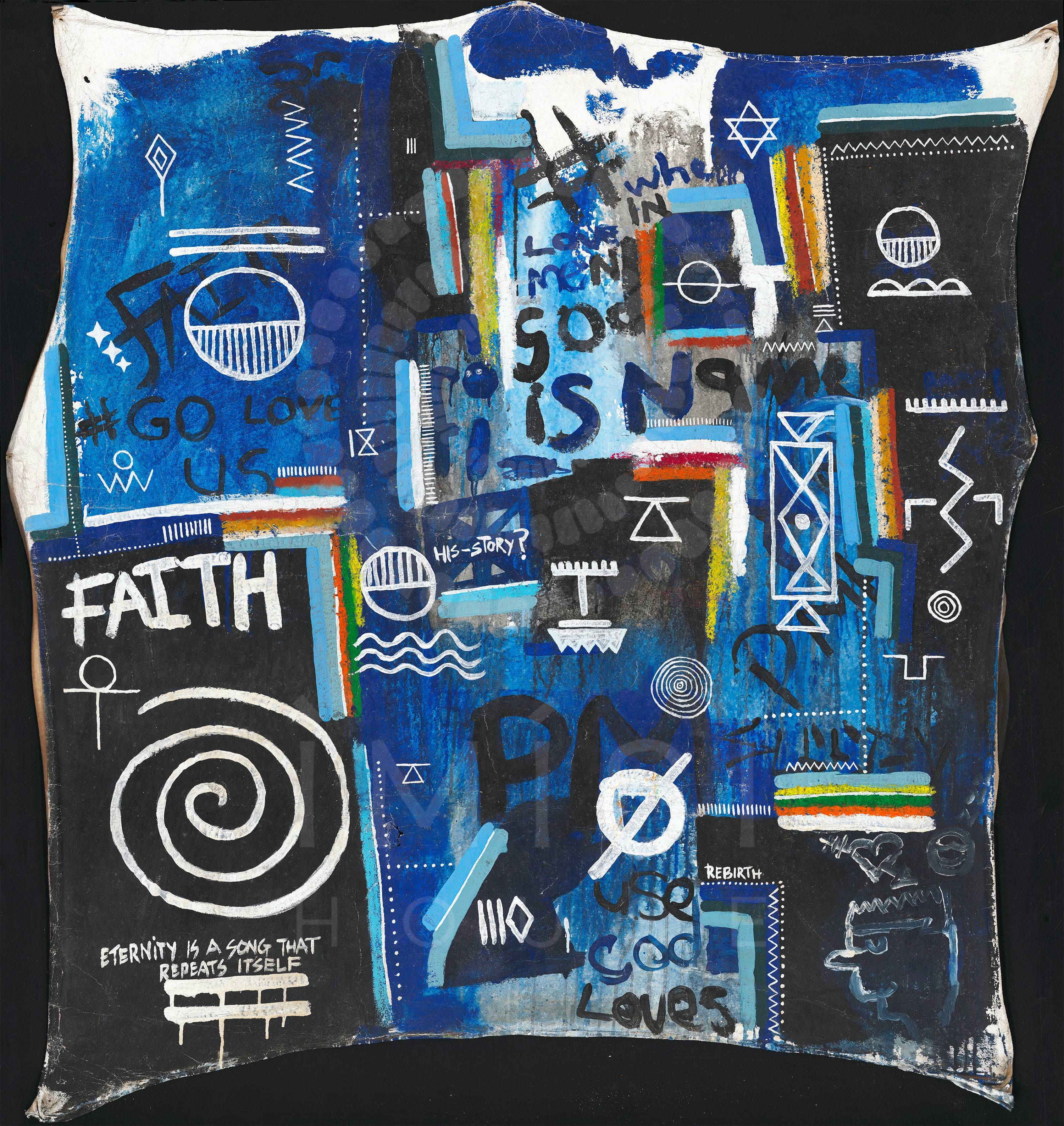 Layered throughout the composition are universal religious and spiritual symbols, woven together with fragments of text such as “faith,” “rebirth,” and “God loves us all.” Rather than presenting a singular doctrine, the piece reflects a convergence of belief systems, pointing to a deeper, collective truth: that love, meaning, and connection exist across cultures, languages, and generations. The visual language; at once chaotic and intentional, mirrors the complexity of human thought while anchoring itself in a quiet, unifying message of divine presence within everyday life.