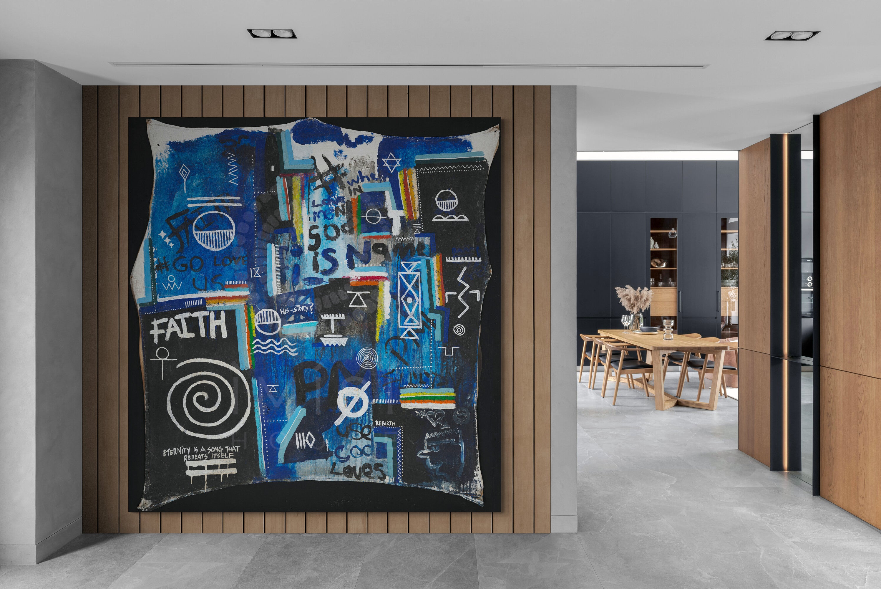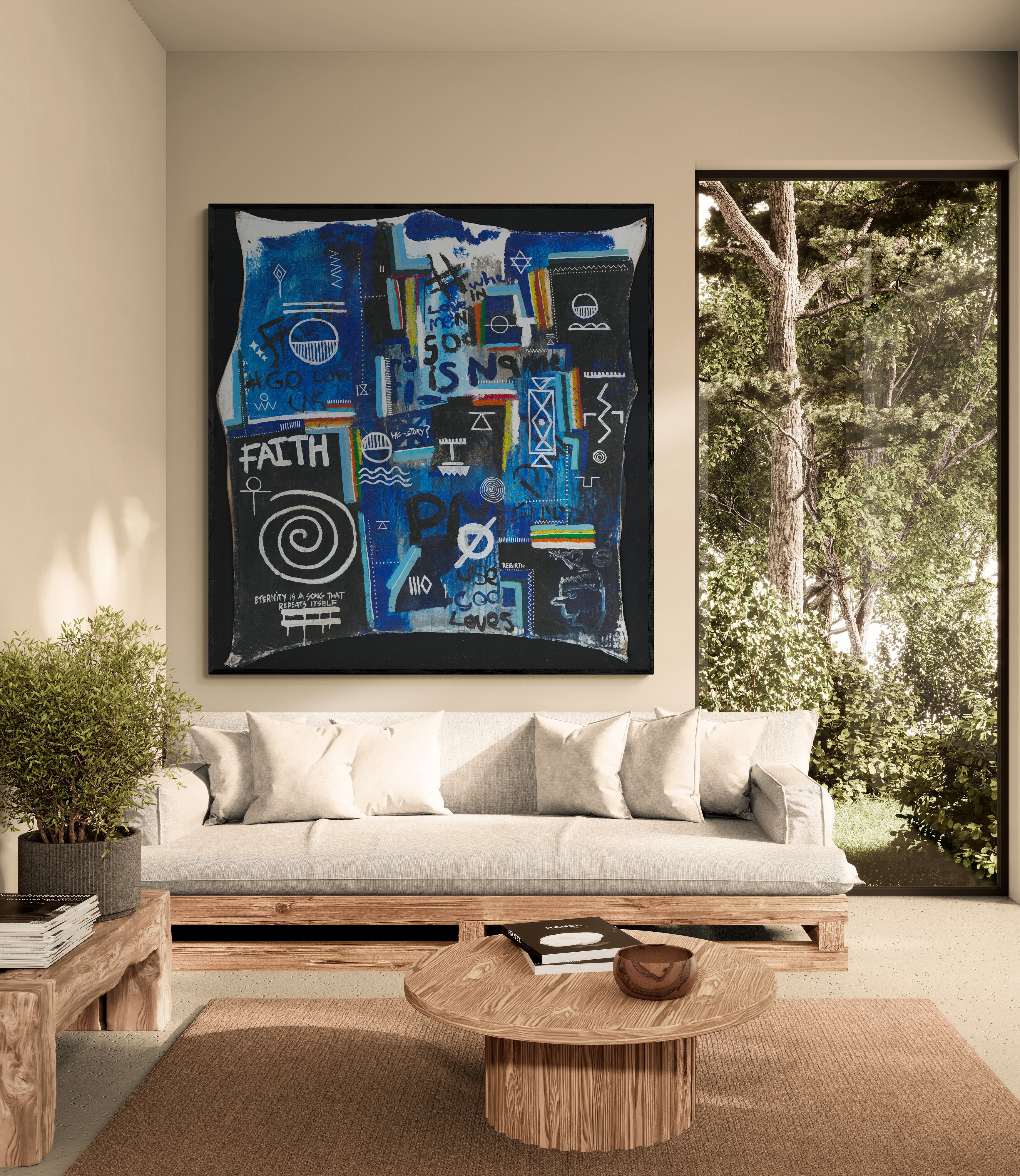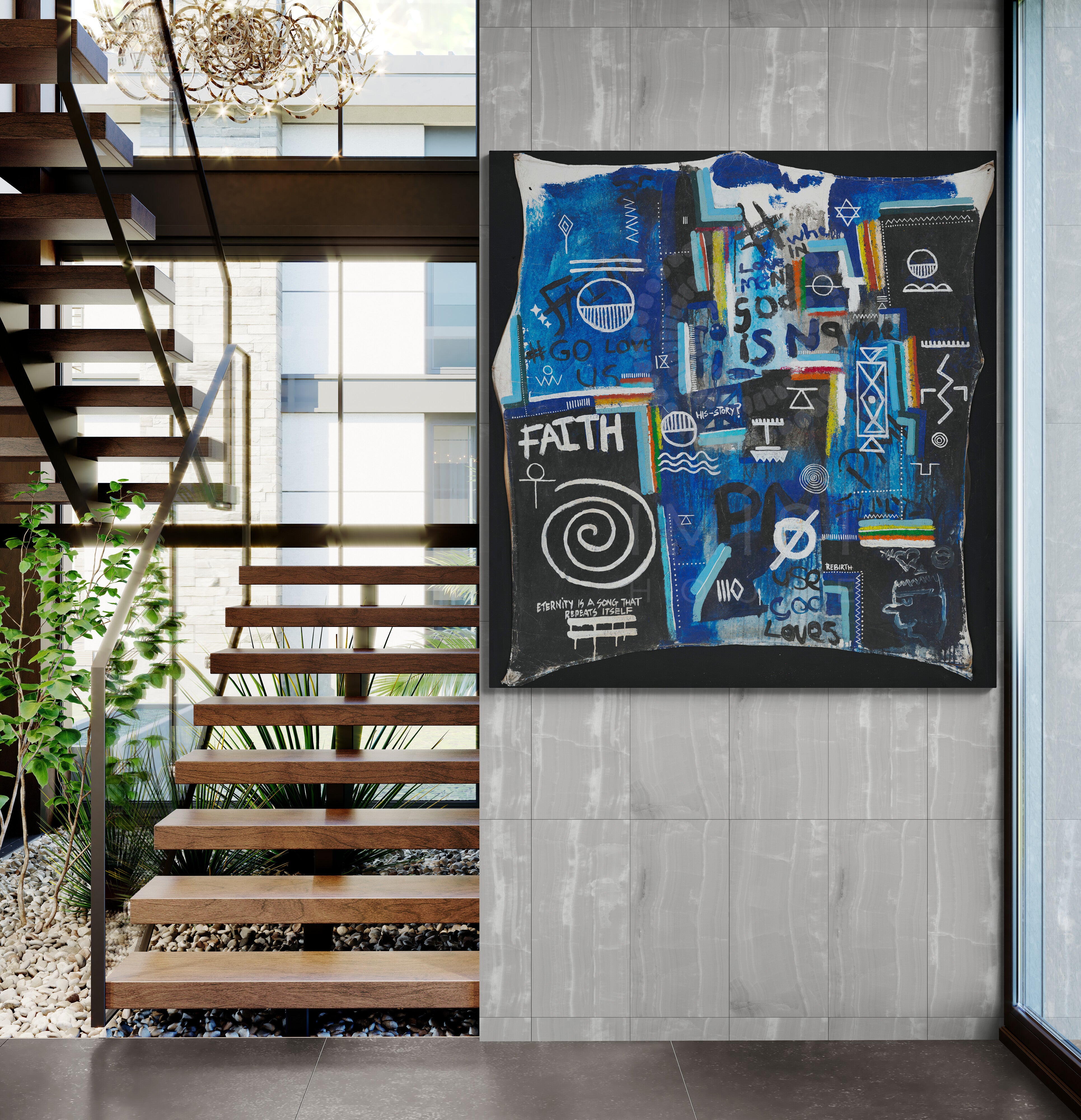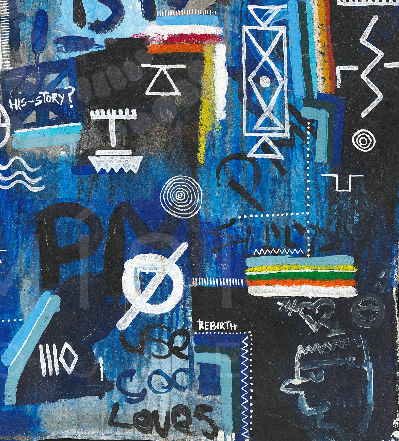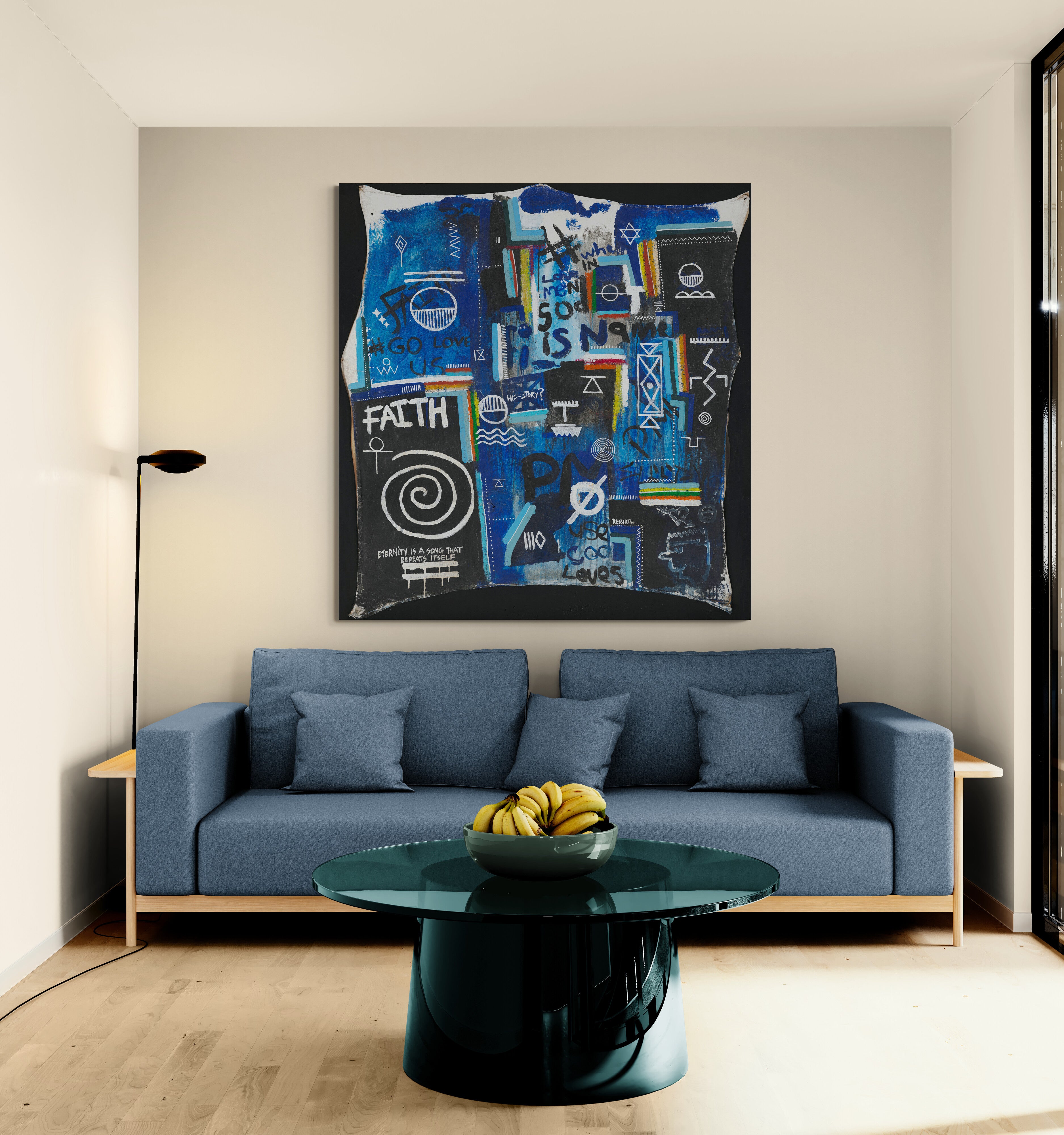 Layered throughout the composition are universal religious and spiritual symbols, woven together with fragments of text such as “faith,” “rebirth,” and “God loves us all.” Rather than presenting a singular doctrine, the piece reflects a convergence of belief systems, pointing to a deeper, collective truth: that love, meaning, and connection exist across cultures, languages, and generations. The visual language; at once chaotic and intentional, mirrors the complexity of human thought while anchoring itself in a quiet, unifying message of divine presence within everyday life.